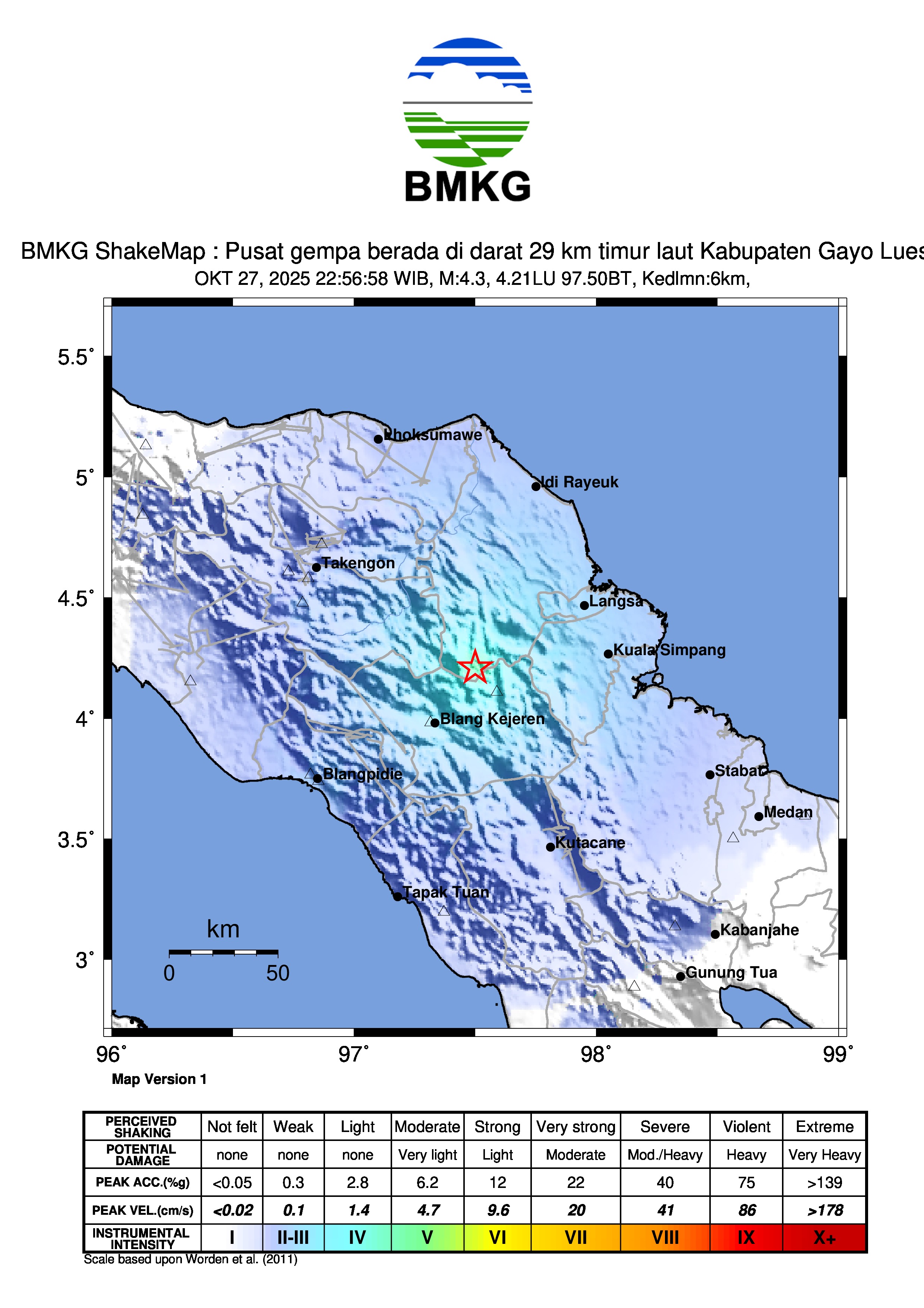Pusat gempa berada di darat 29 km timur laut Kabupaten Gayo Lues