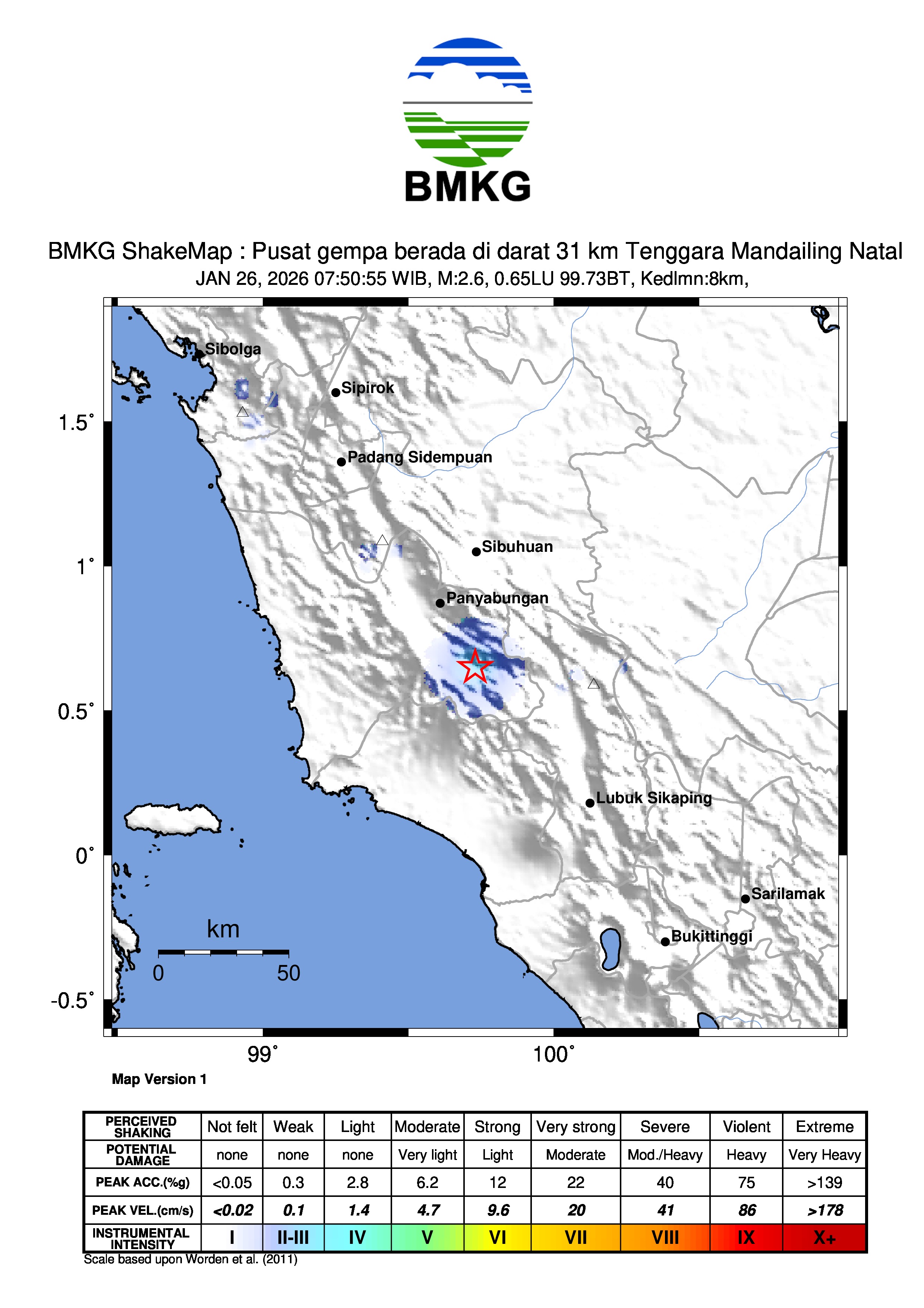 Pusat gempa berada di darat 31 km Tenggara Mandailing Natal