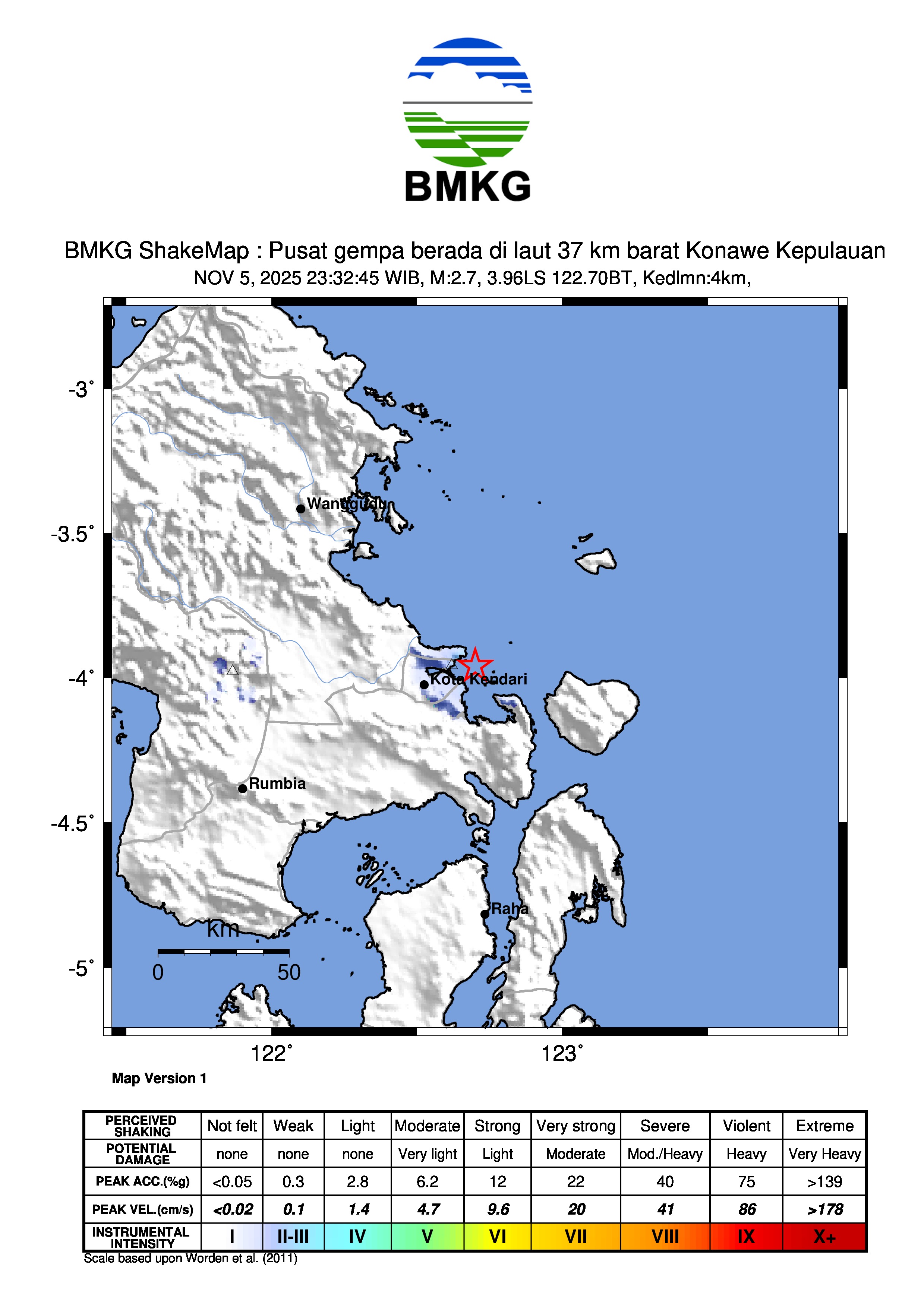 Pusat gempa berada di laut 37 km barat Konawe Kepulauan