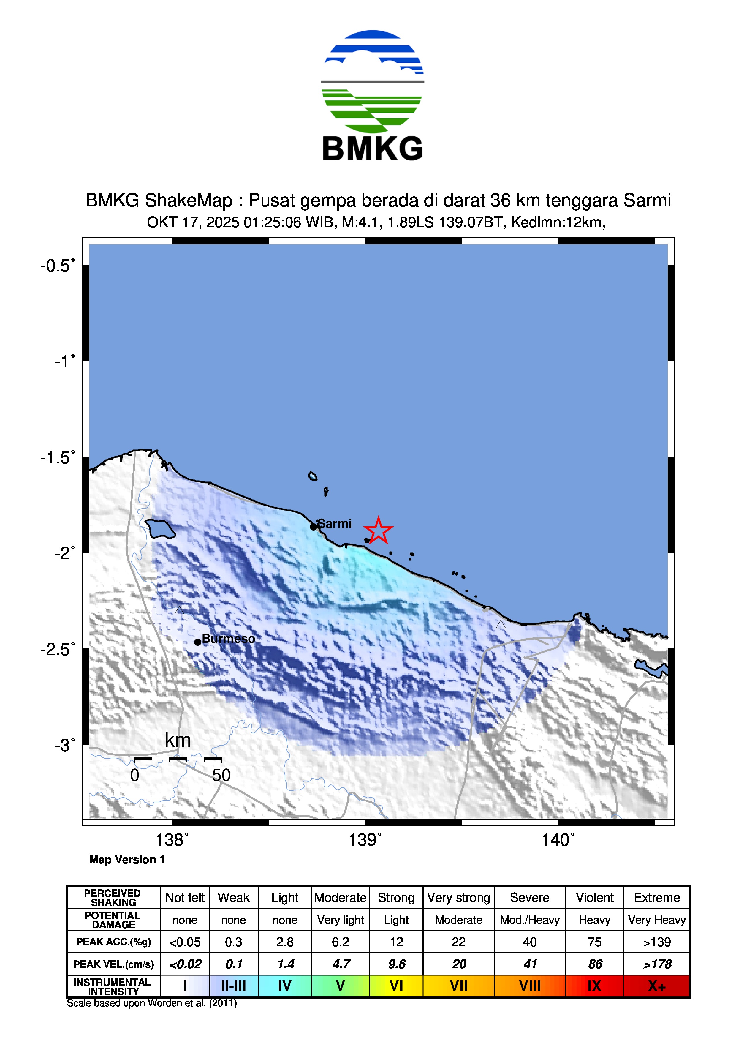Pusat gempa berada di darat 36 km Tenggara Sarmi