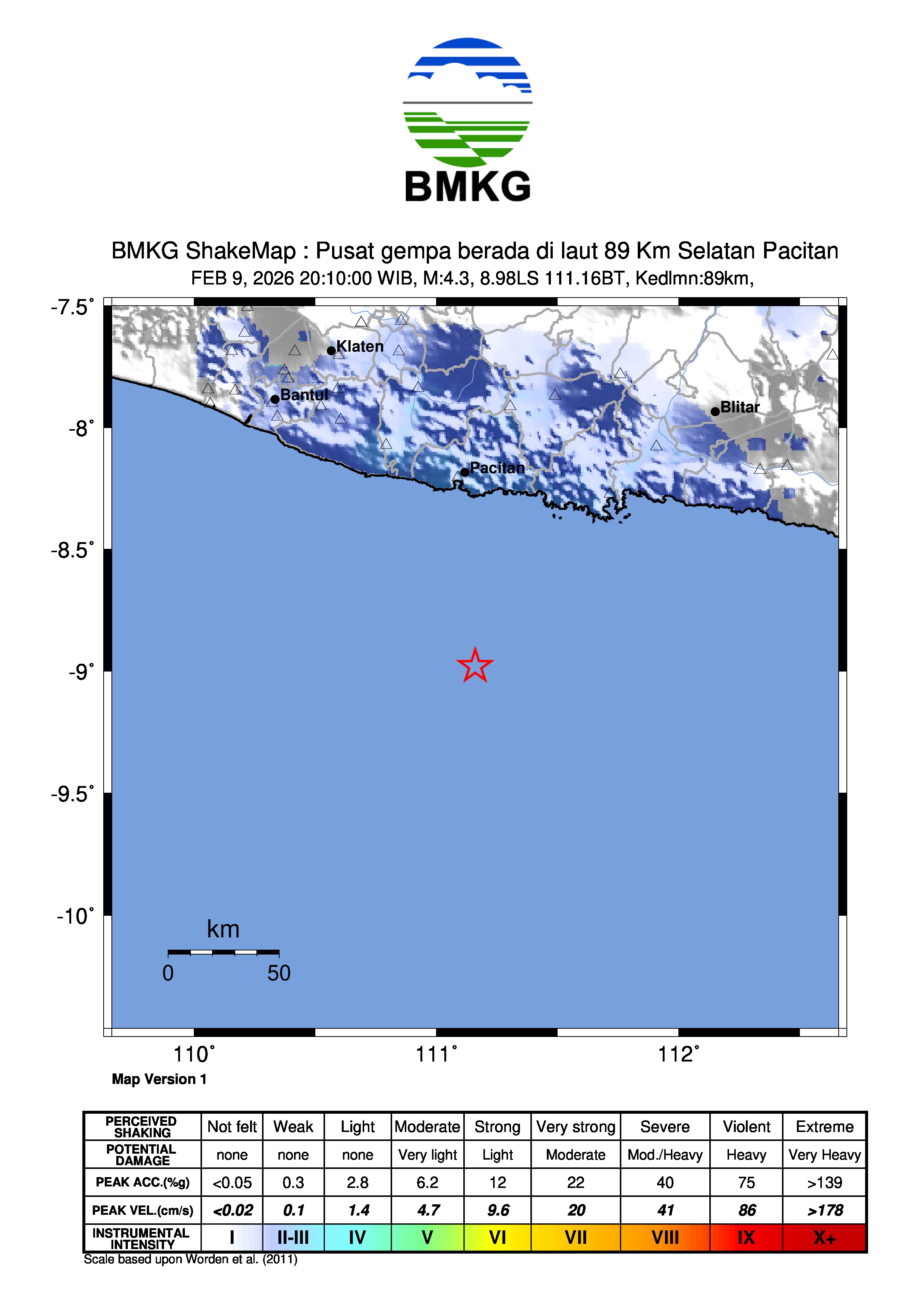 Pusat gempa berada di laut 89 Km Selatan Pacitan