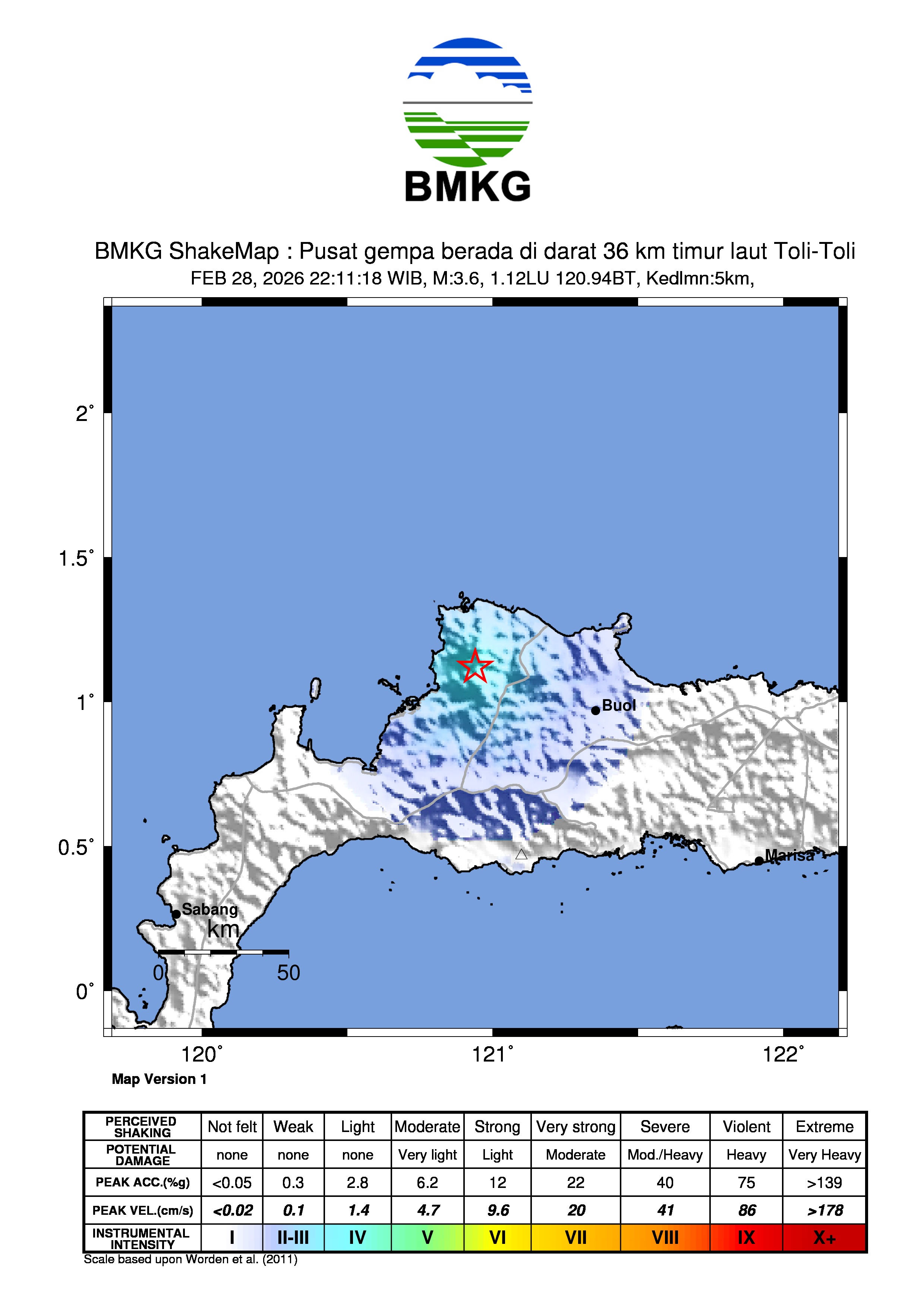 Pusat gempa berada di darat 36 km timur laut Toli-Toli
