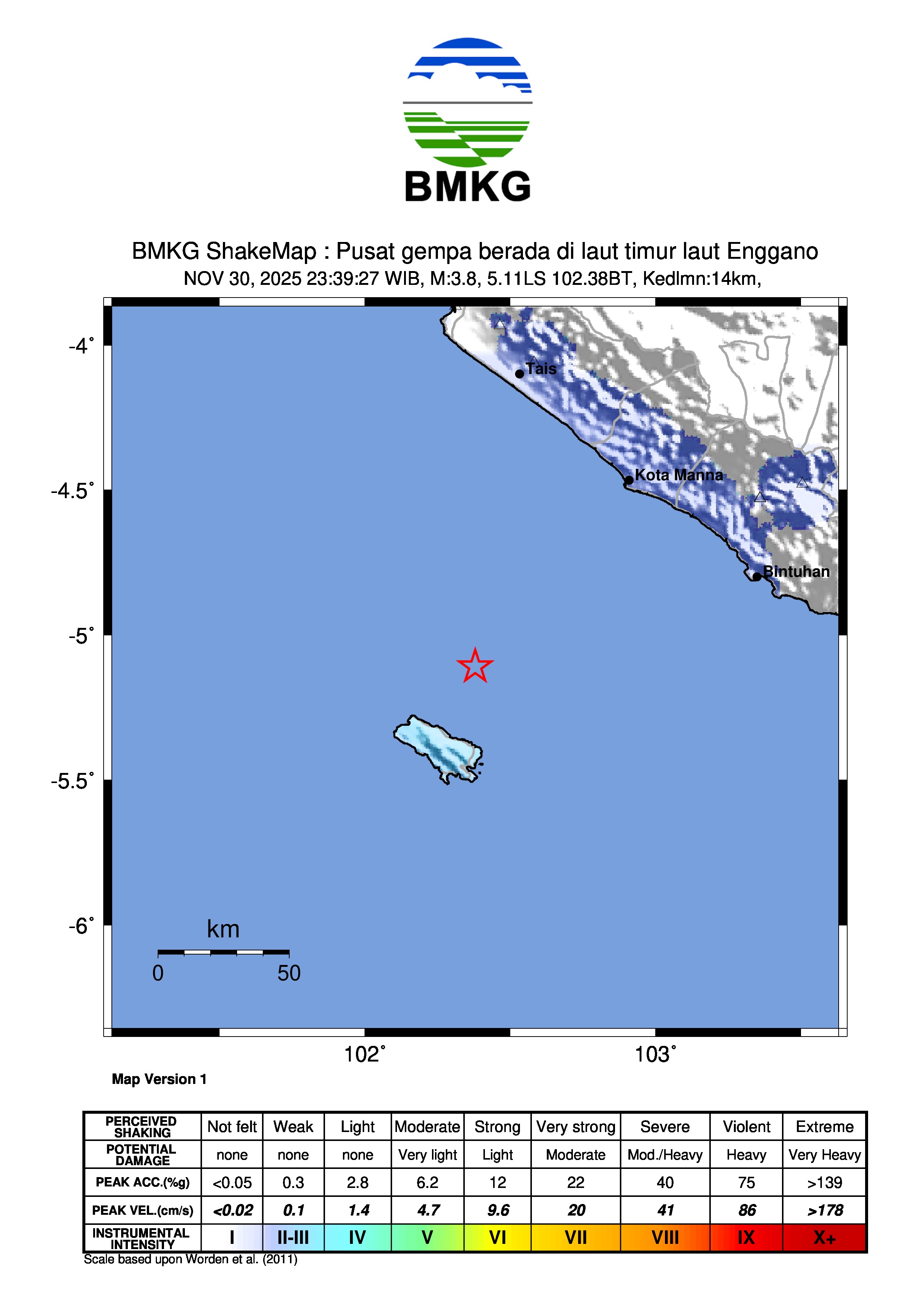 Pusat gempa berada di laut 28 km timur laut Enggano