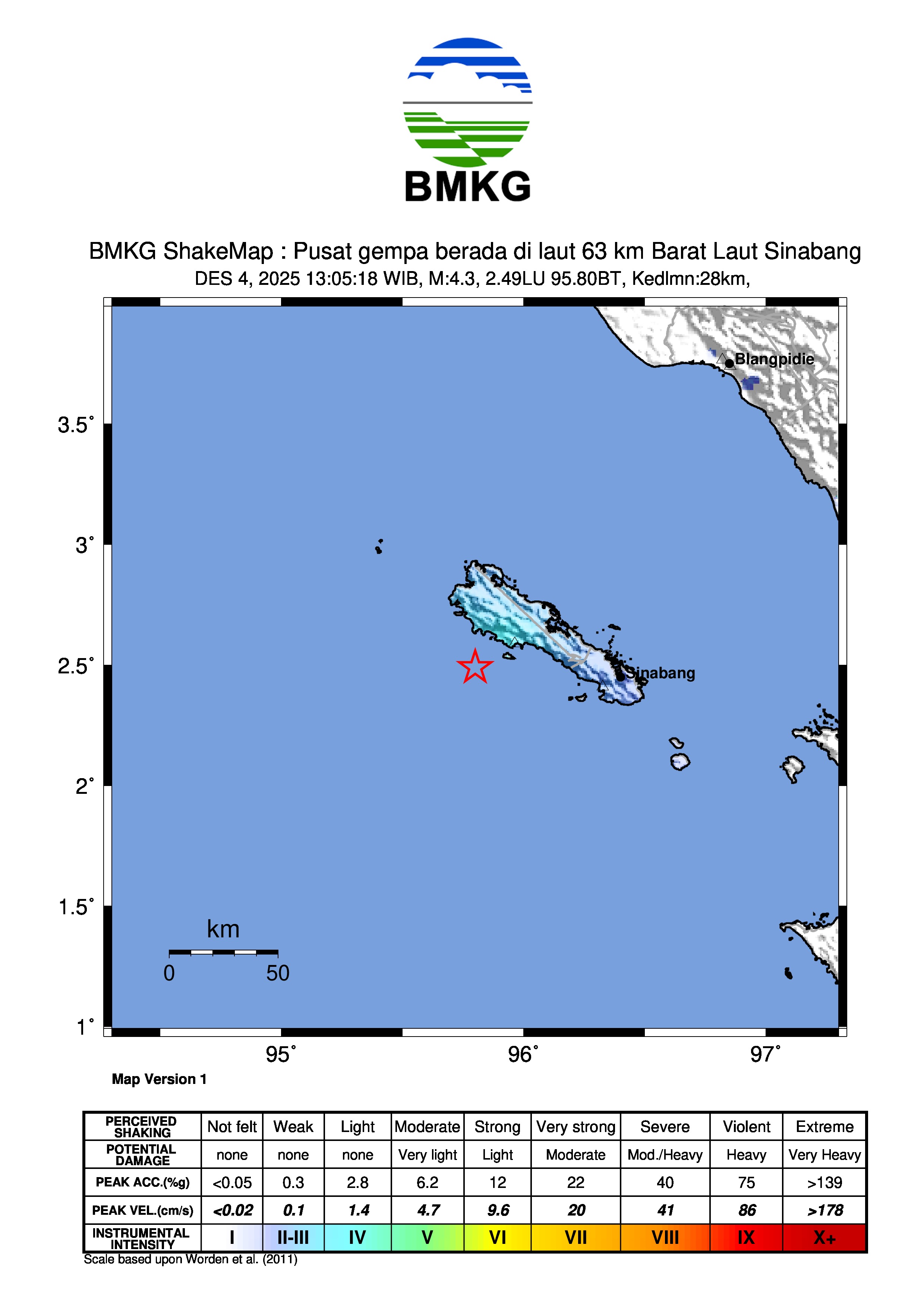 Pusat gempa berada di laut 63 km Barat Laut Sinabang