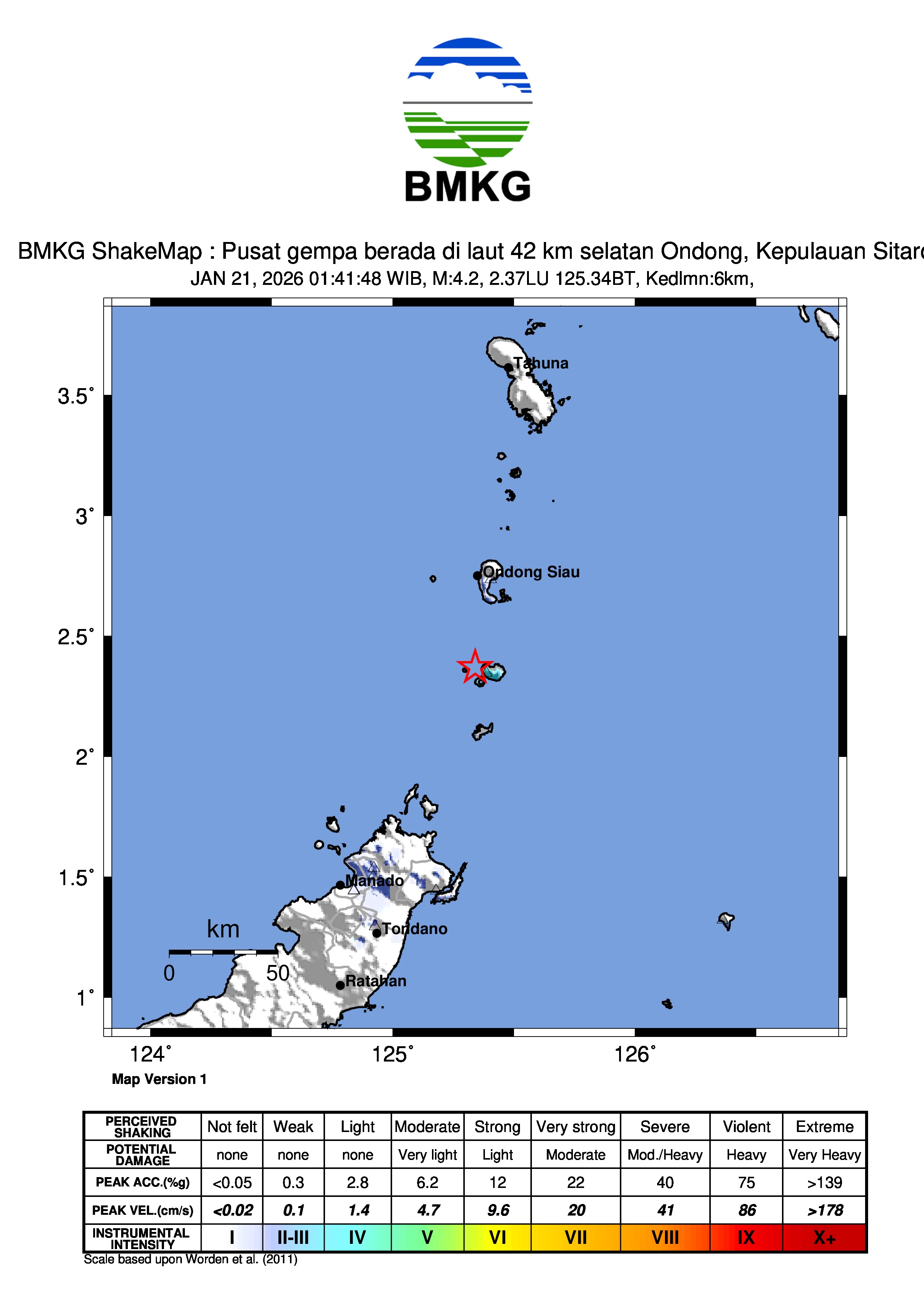 Pusat gempa berada di laut 42 km selatan Ondong, Kepulauan Sitaro