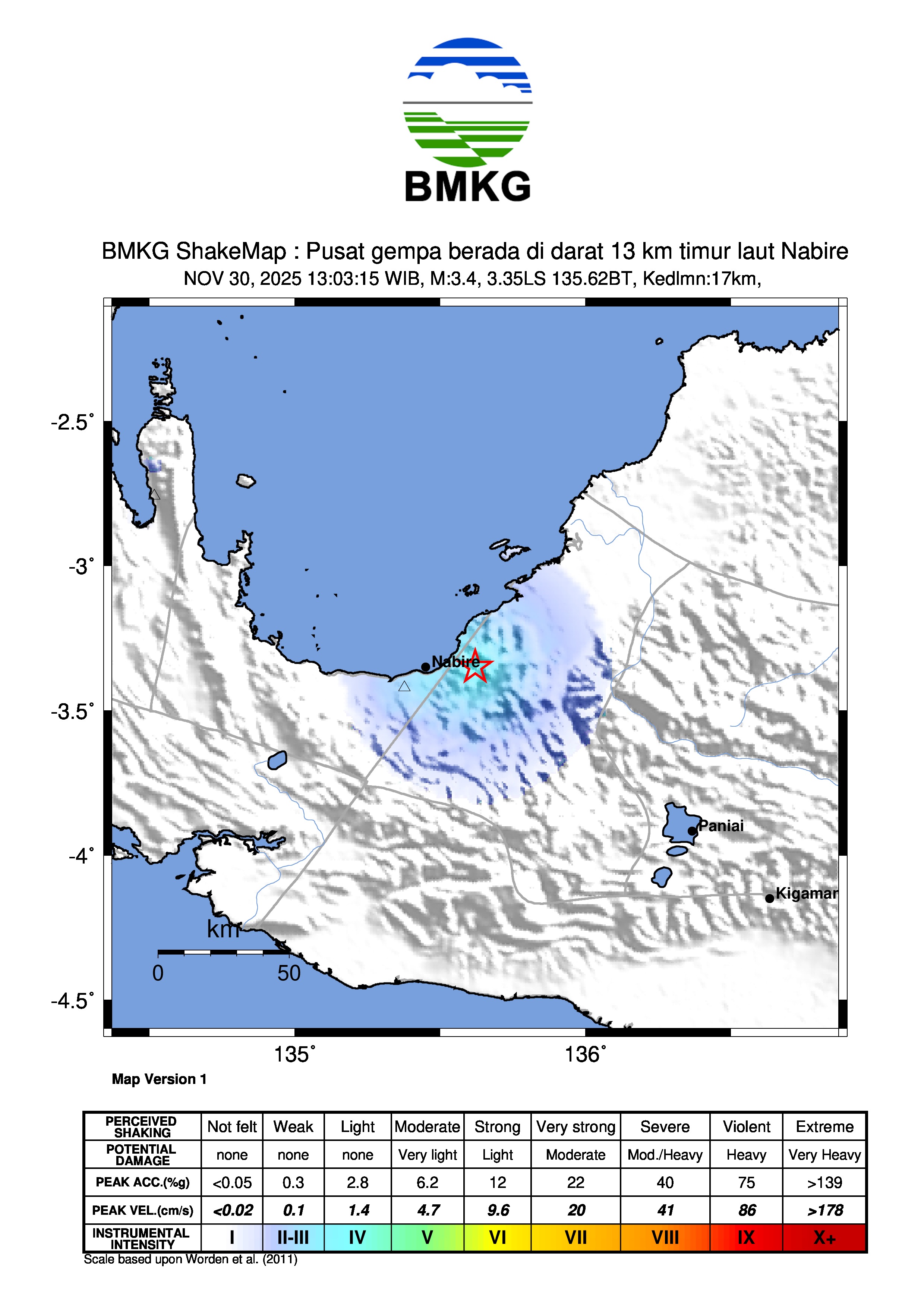 Pusat gempa berada di darat 13 km timur laut Nabire