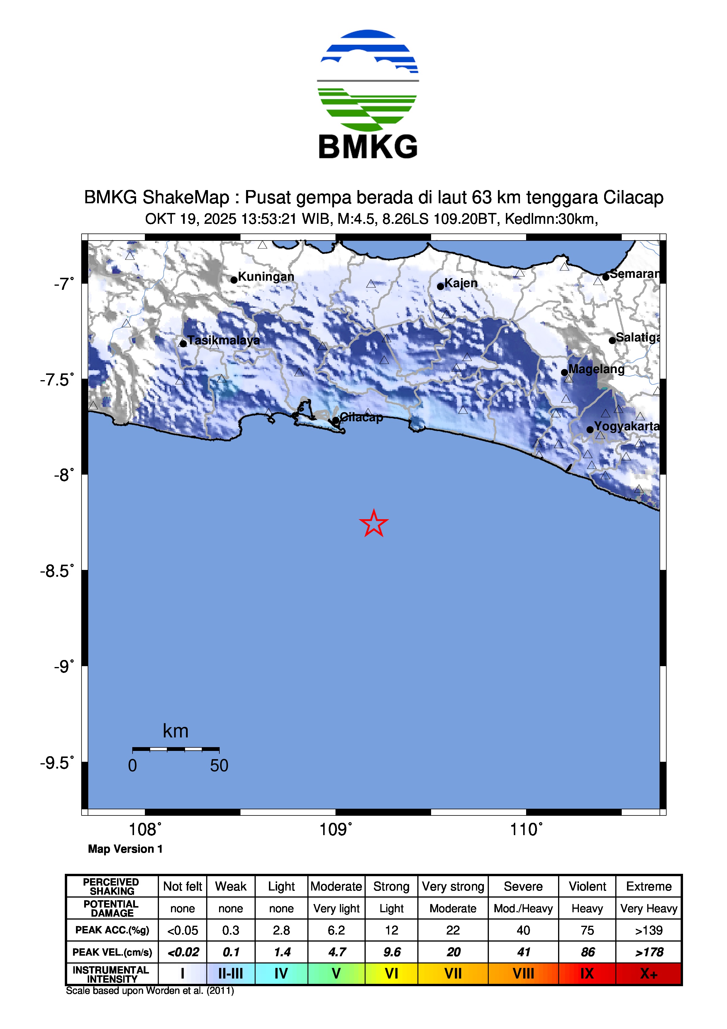 Pusat gempa berada di laut 63 km tenggara Cilacap