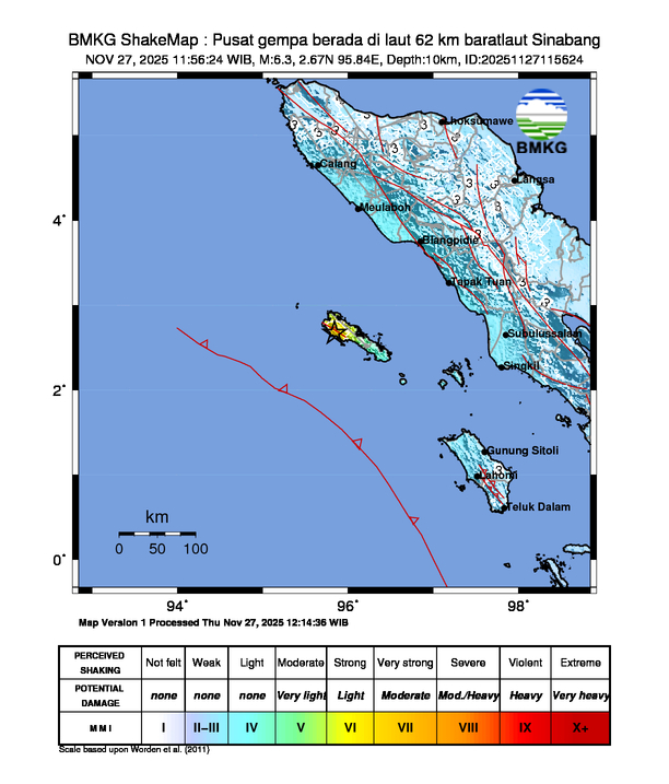 Pusat gempa berada di laut 62 km baratlaut Sinabang