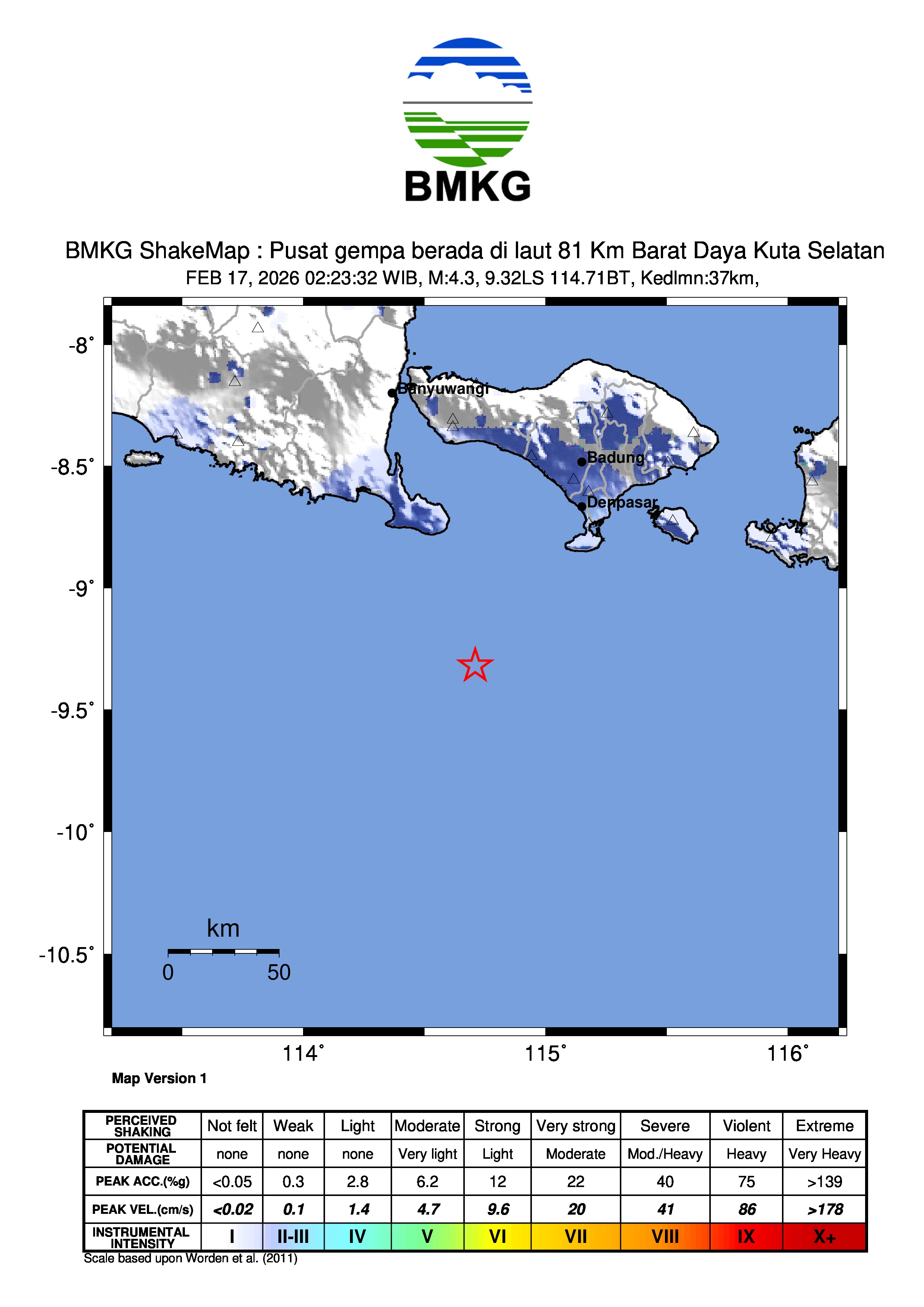 Pusat gempa berada di laut 81 Km Barat Daya Kuta Selatan