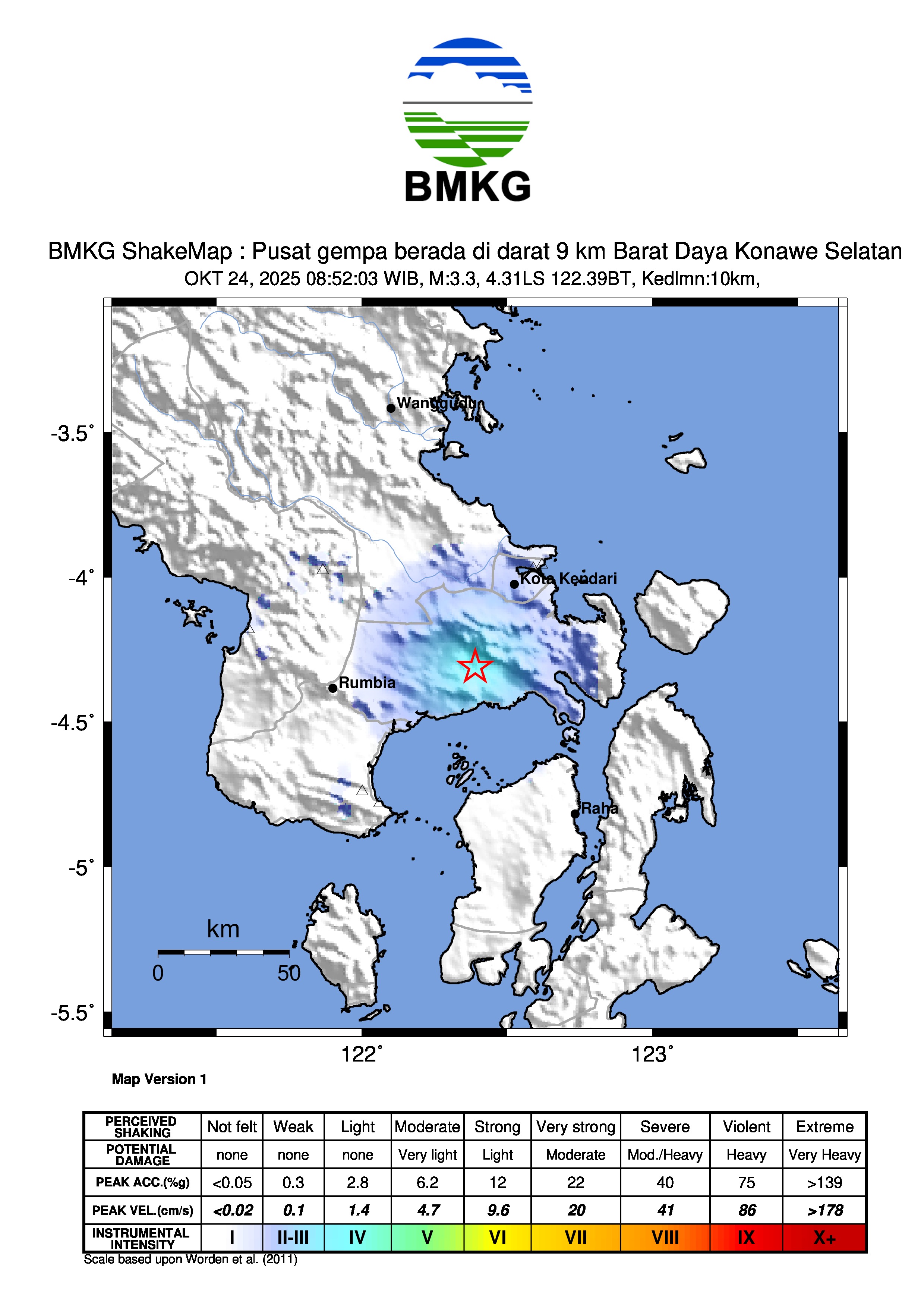 Pusat gempa berada di darat 9 km Barat Daya Konawe Selatan