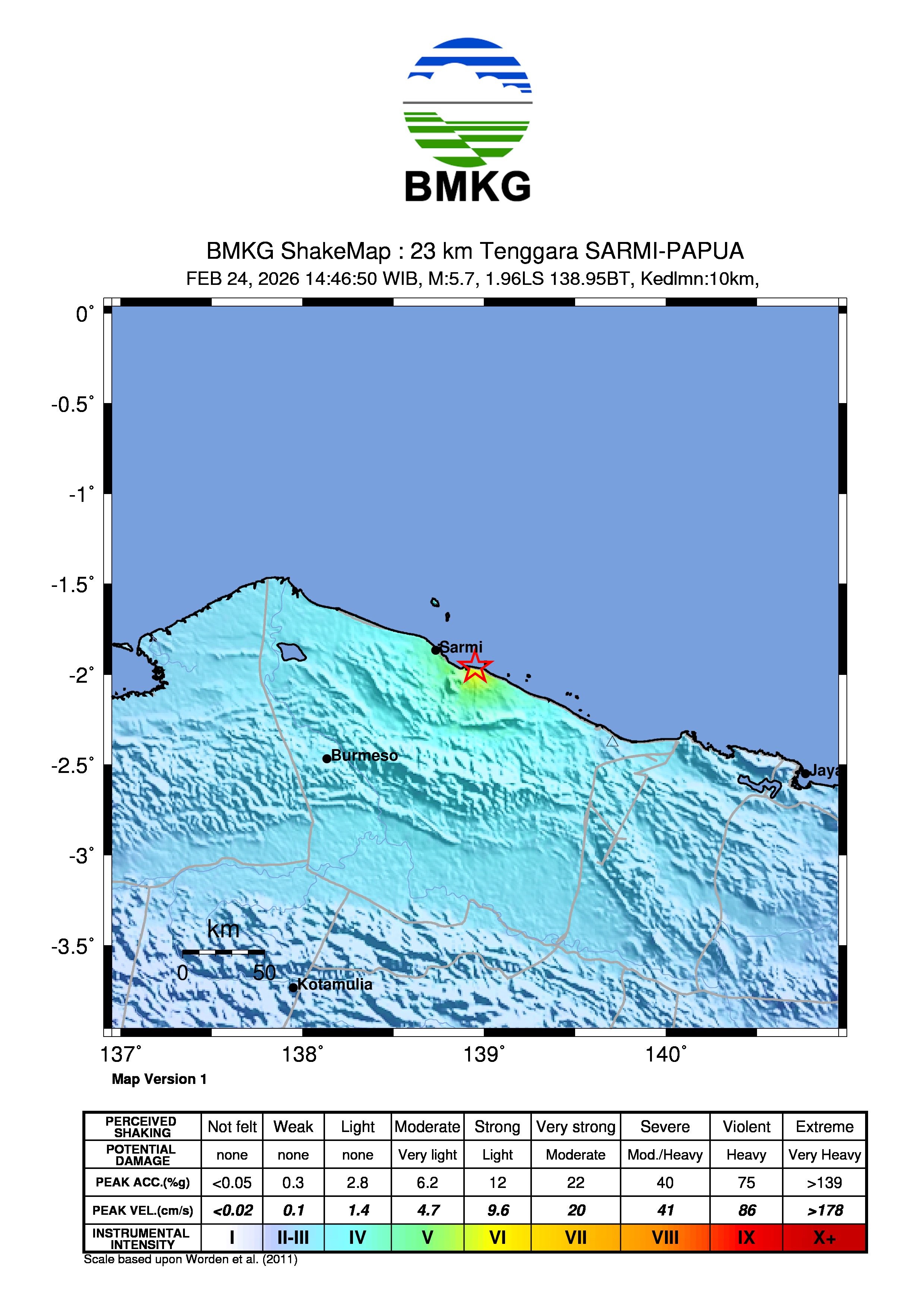 Pusat gempa berada di darat 23 km tenggara Sarmi