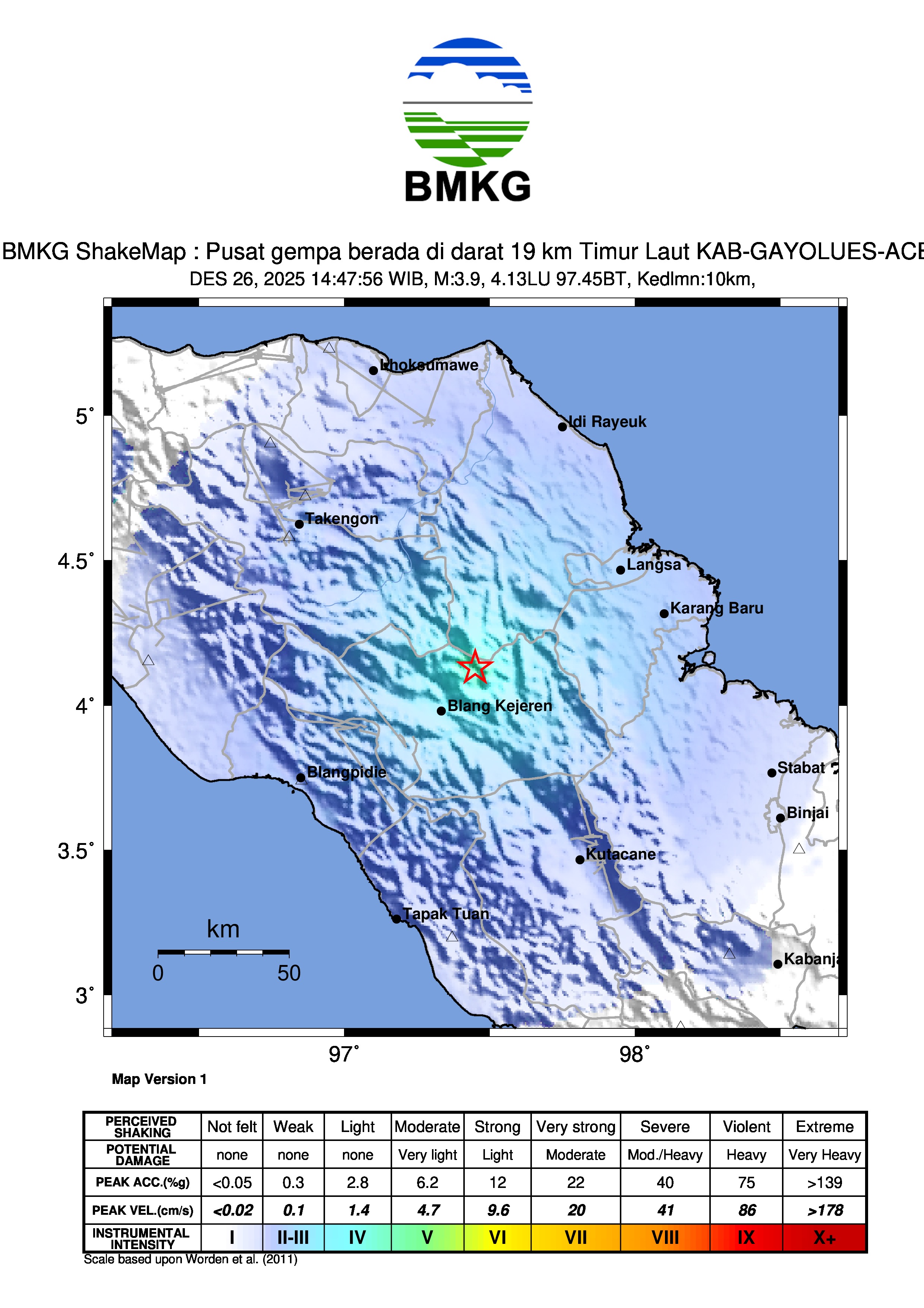 Pusat gempa berada di darat 19 km Timur Laut KAB-GAYOLUES-ACEH