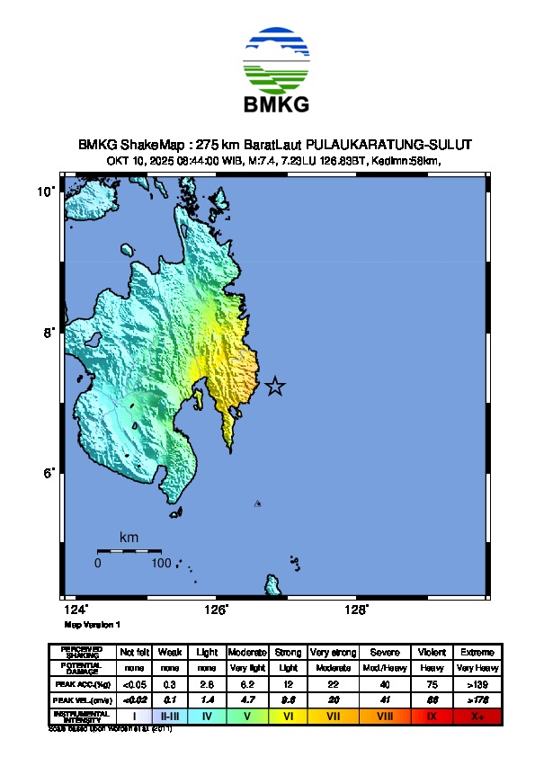 Pemutakhiran Peringatan Dini, Tsunami akibat gempa dengan kekuatan:7.6, lokasi: 287 km BaratLaut PULAUKARATUNG-SULUT, waktu:10-Okt-25 08:43:58 WIB, telah terdeteksi di ESSANG (09:08WIB) 0.17m