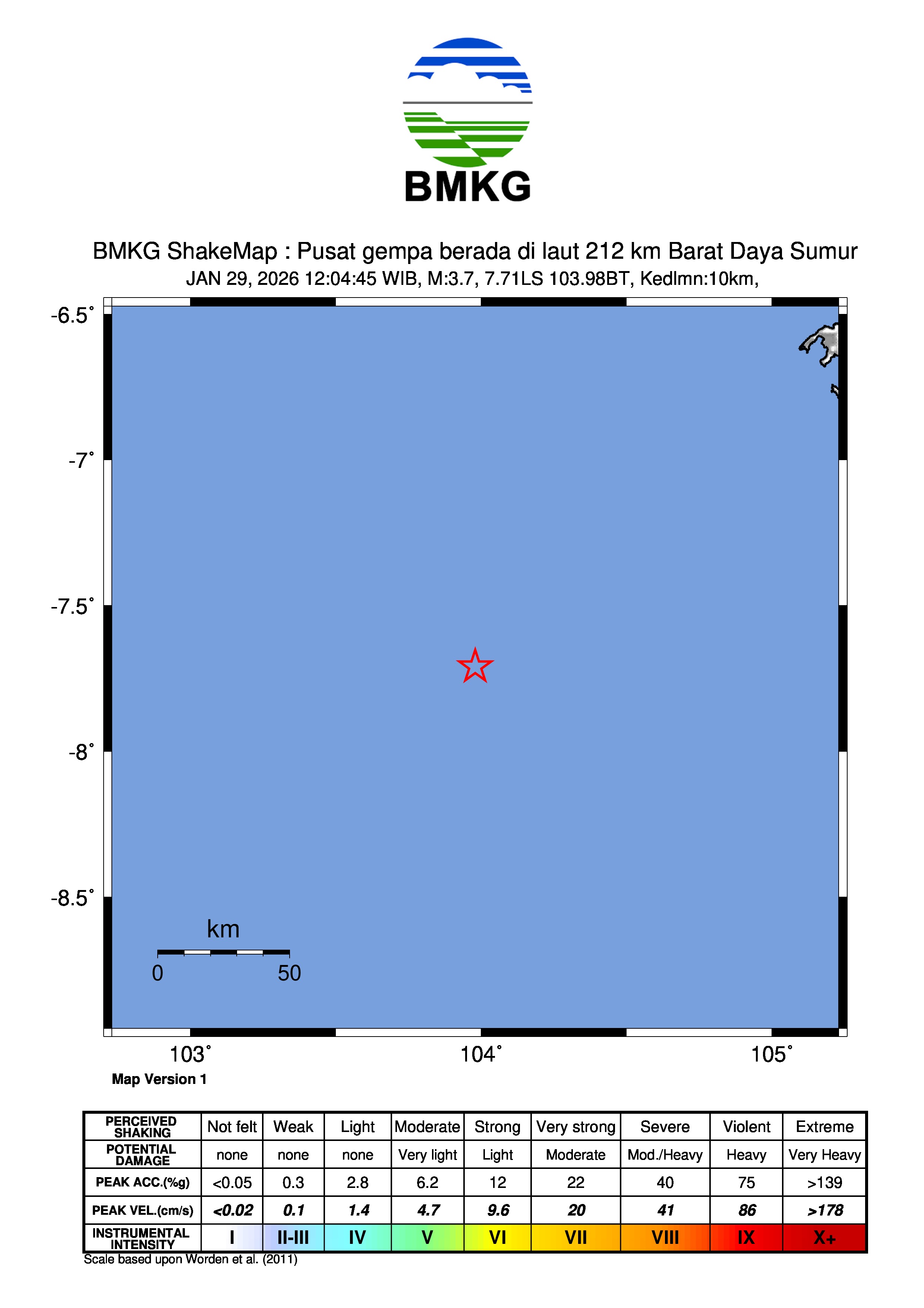 Pusat gempa berada di laut 212 km Barat Daya Sumur