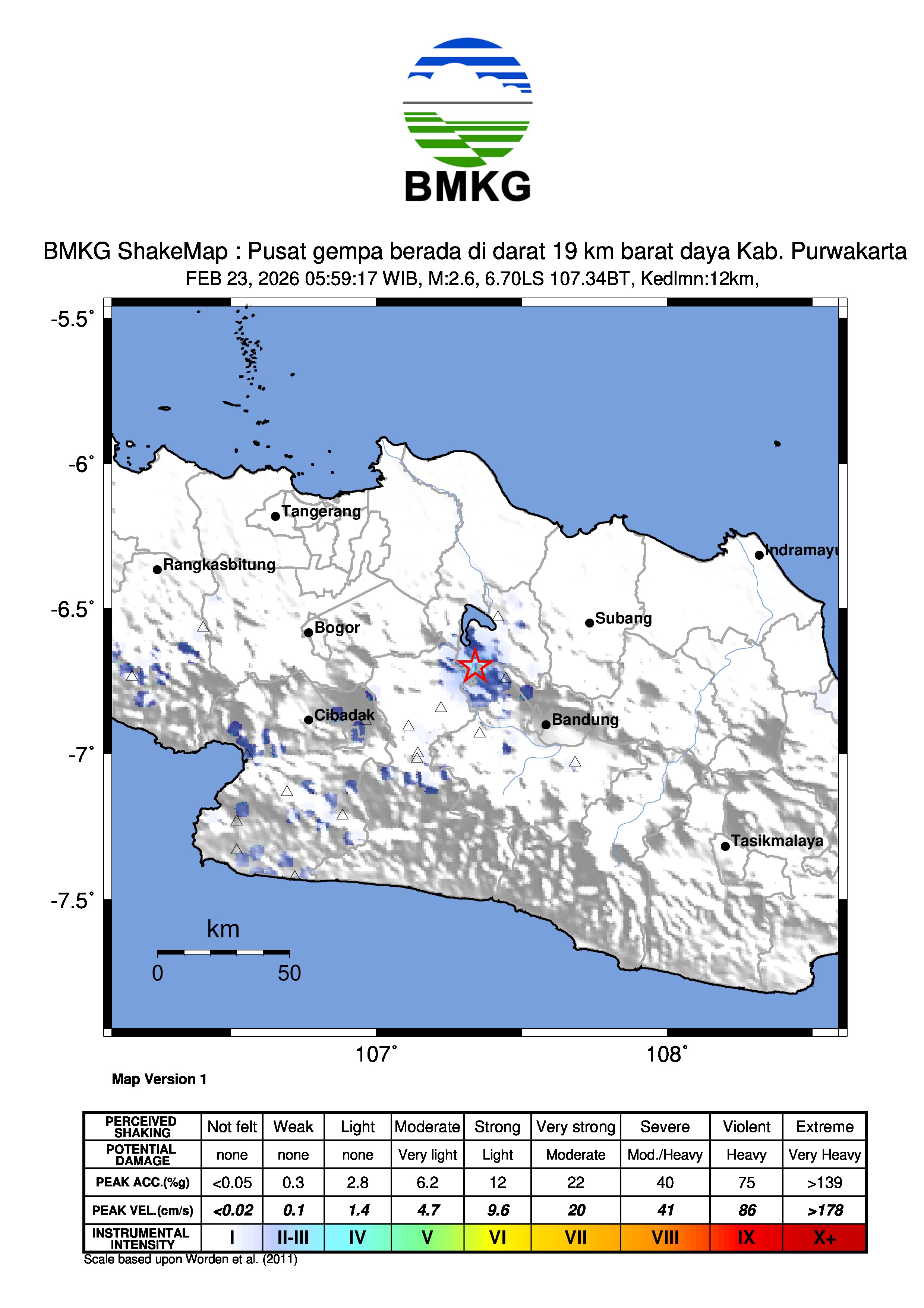 Pusat gempa berada di darat 19 km barat daya Kab. Purwakarta