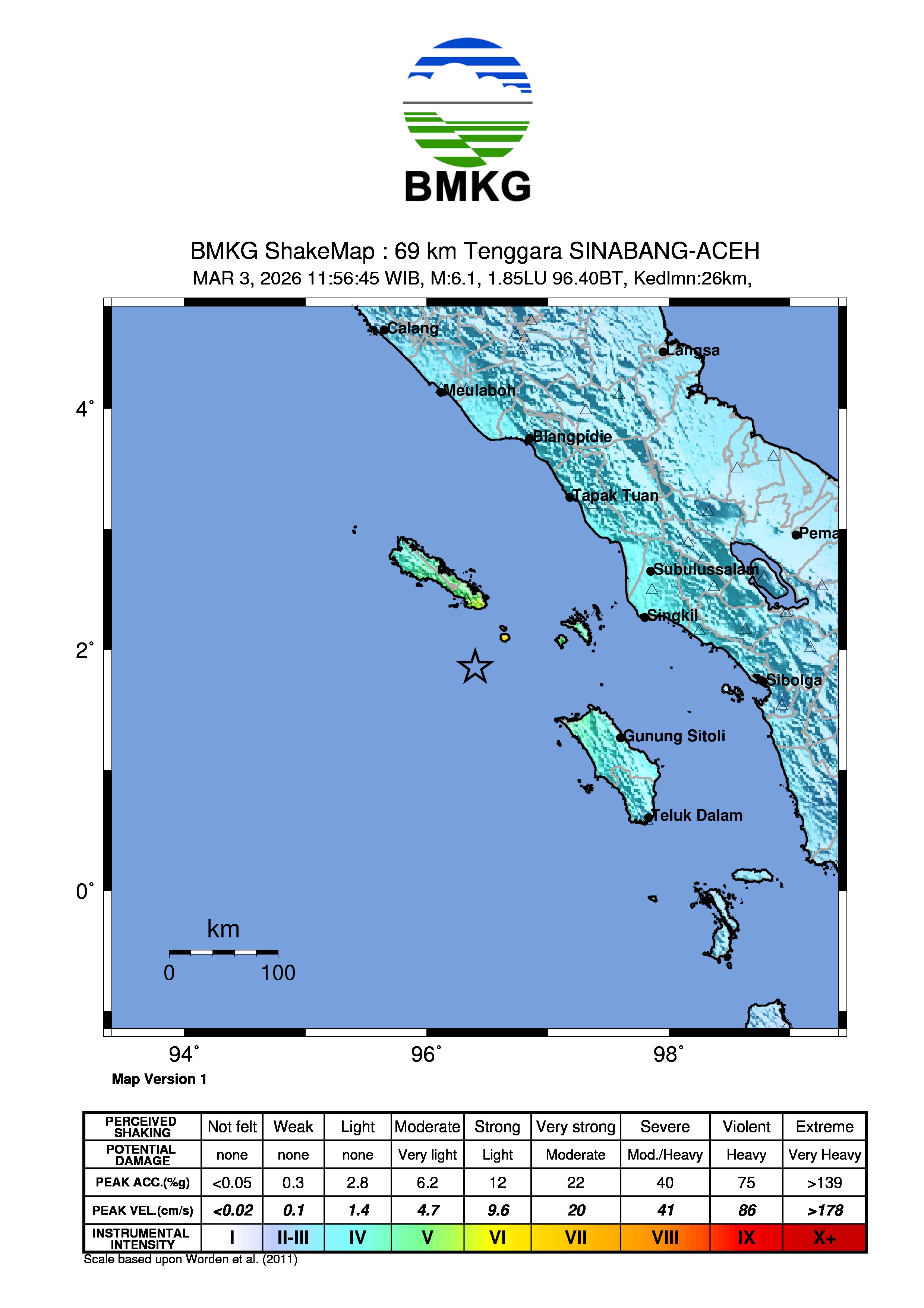 Pusat gempa berada di laut 61 km tenggara Sinabang