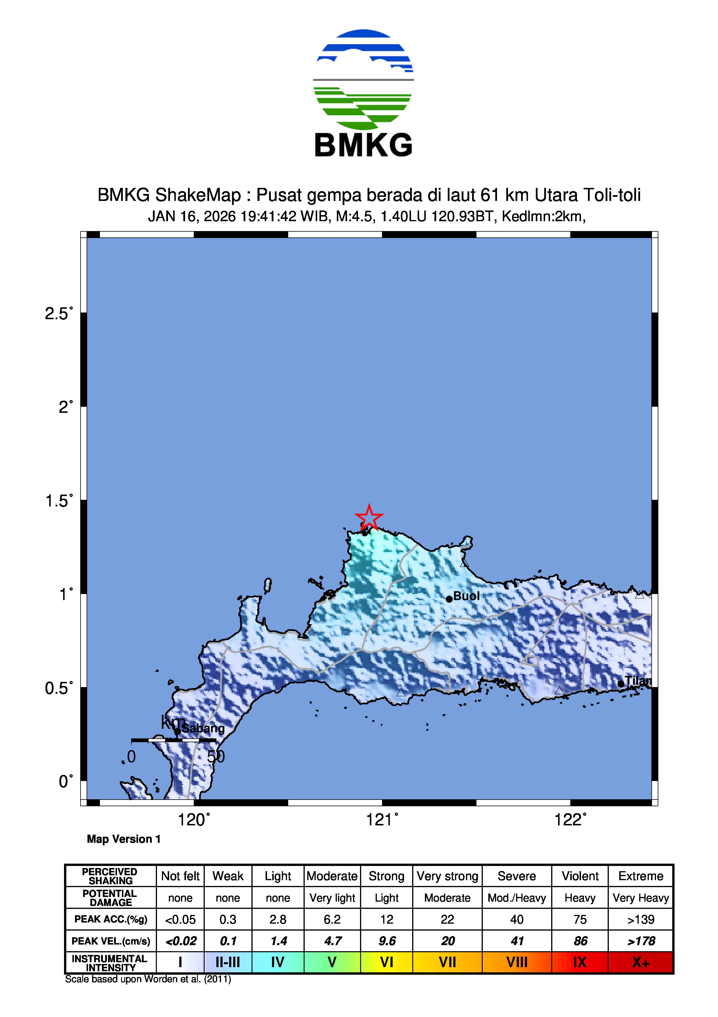 Pusat gempa berada di laut 61 km Utara Toli-toli