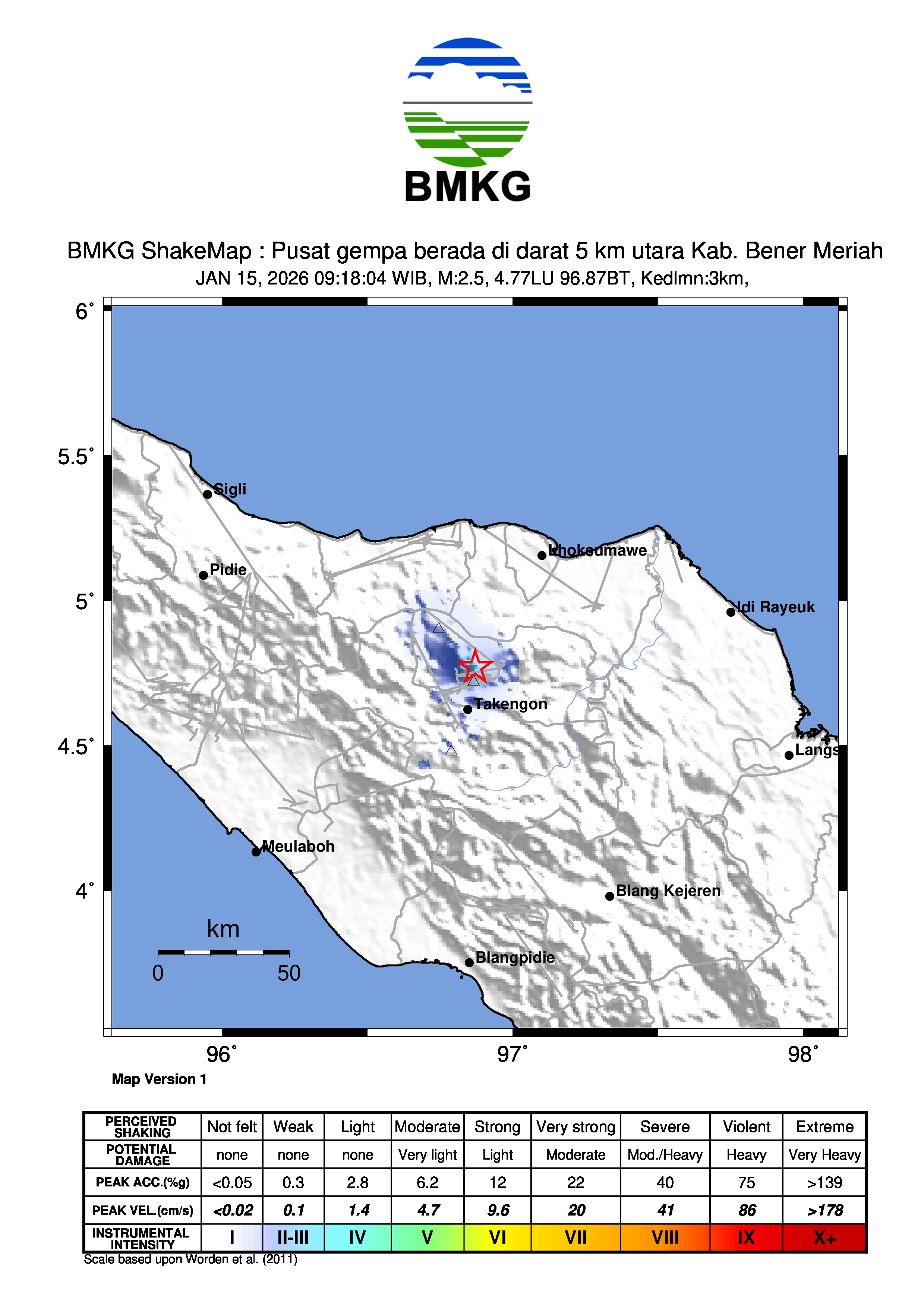 Pusat gempa berada di darat 5 km utara Kab. Bener Meriah