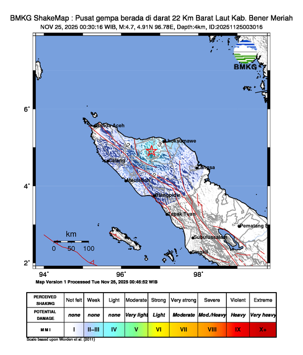 Pusat gempa berada di darat 22 Km Barat Laut Kab. Bener Meriah