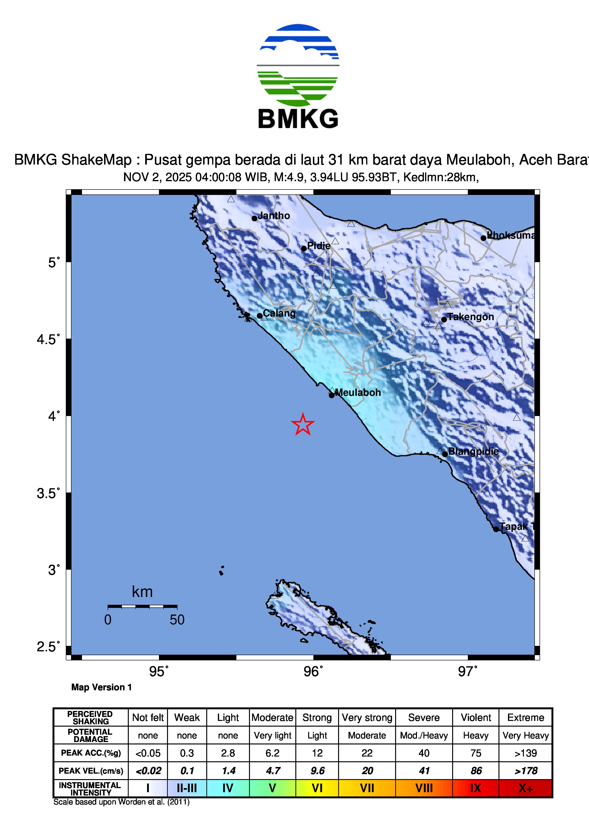 Pusat gempa berada di laut 31 km barat daya Meulaboh, Aceh Barat