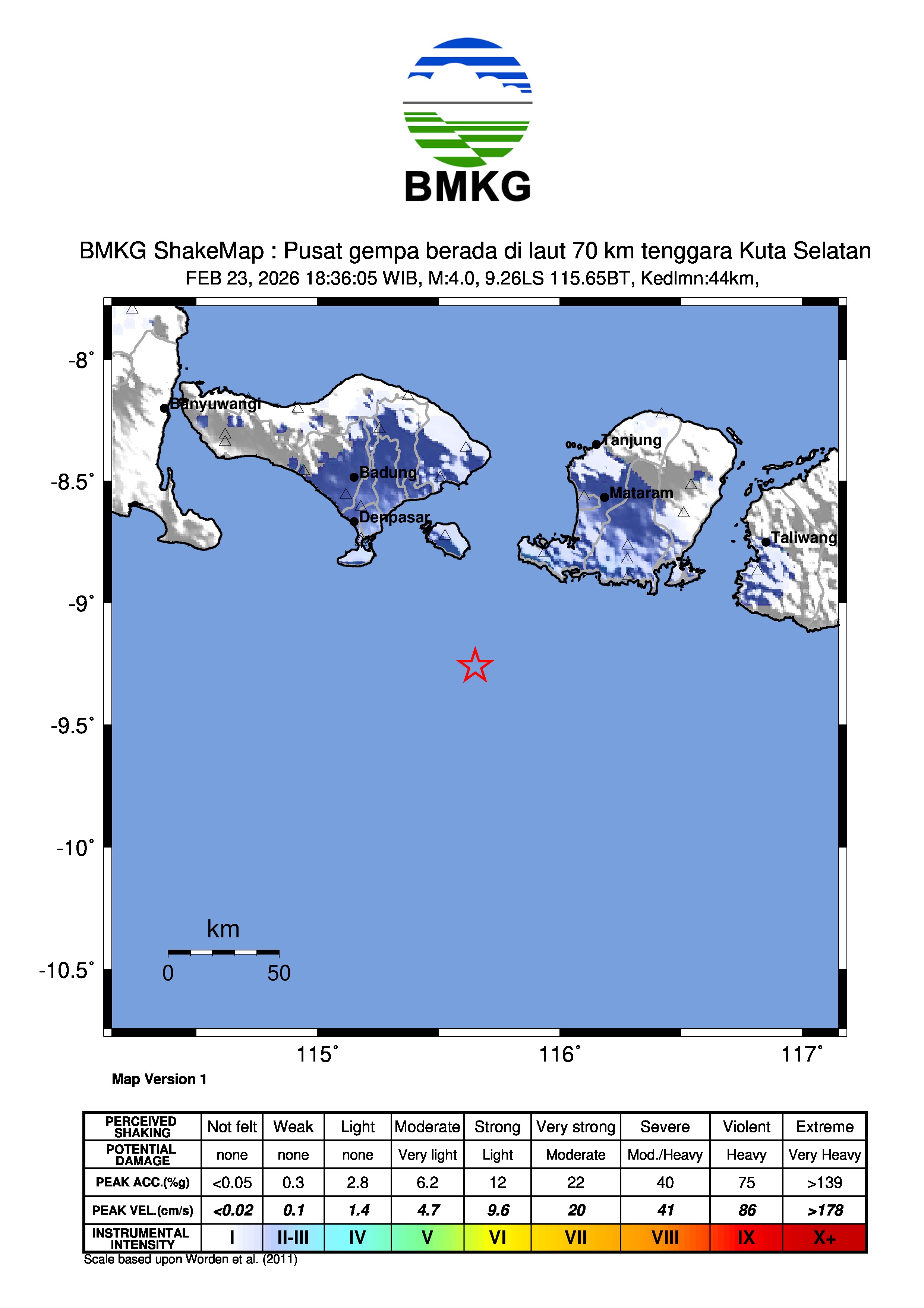 Pusat gempa berada di laut 70 km tenggara Kuta Selatan