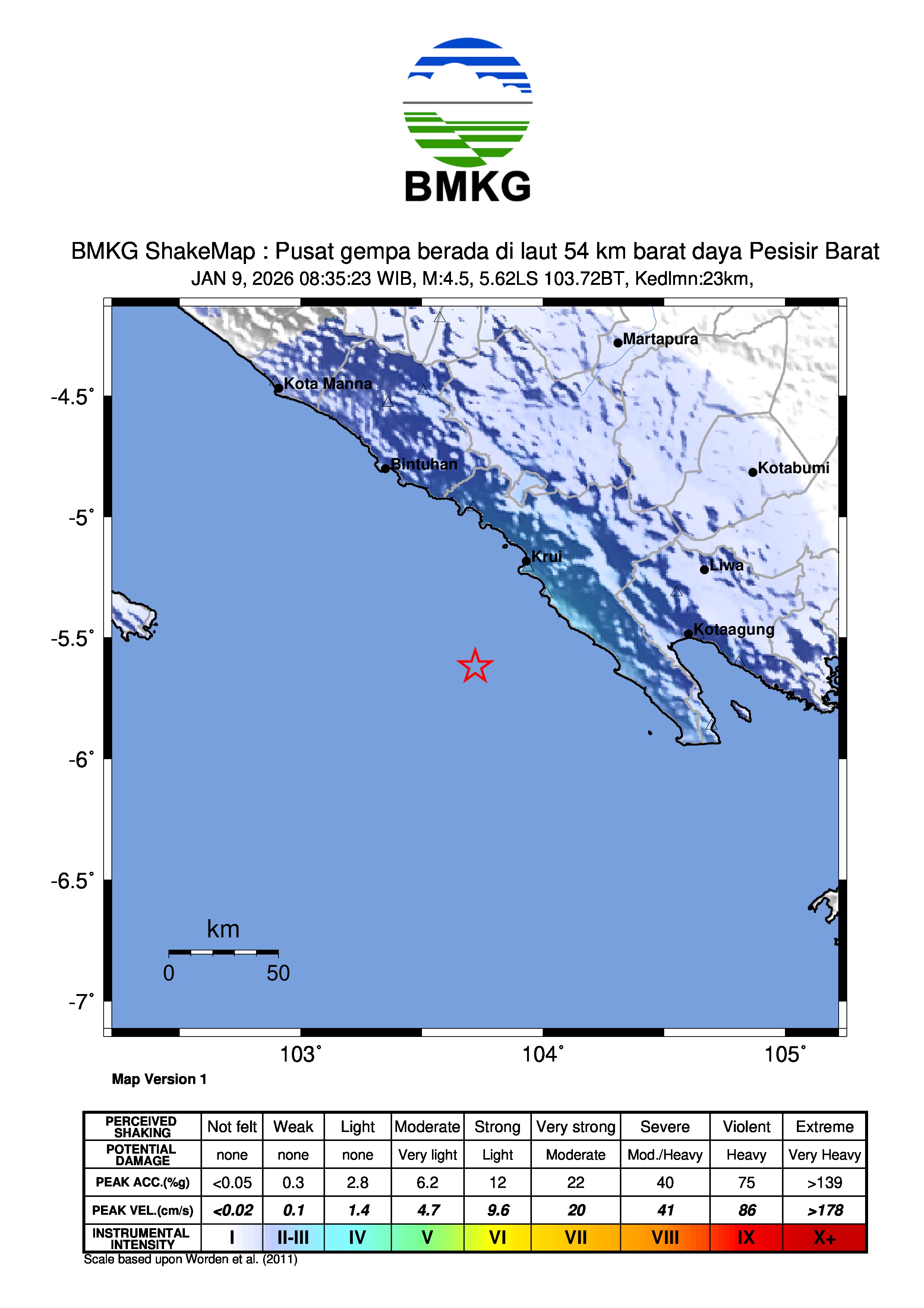 Pusat gempa berada di laut 54 km barat daya Pesisir Barat