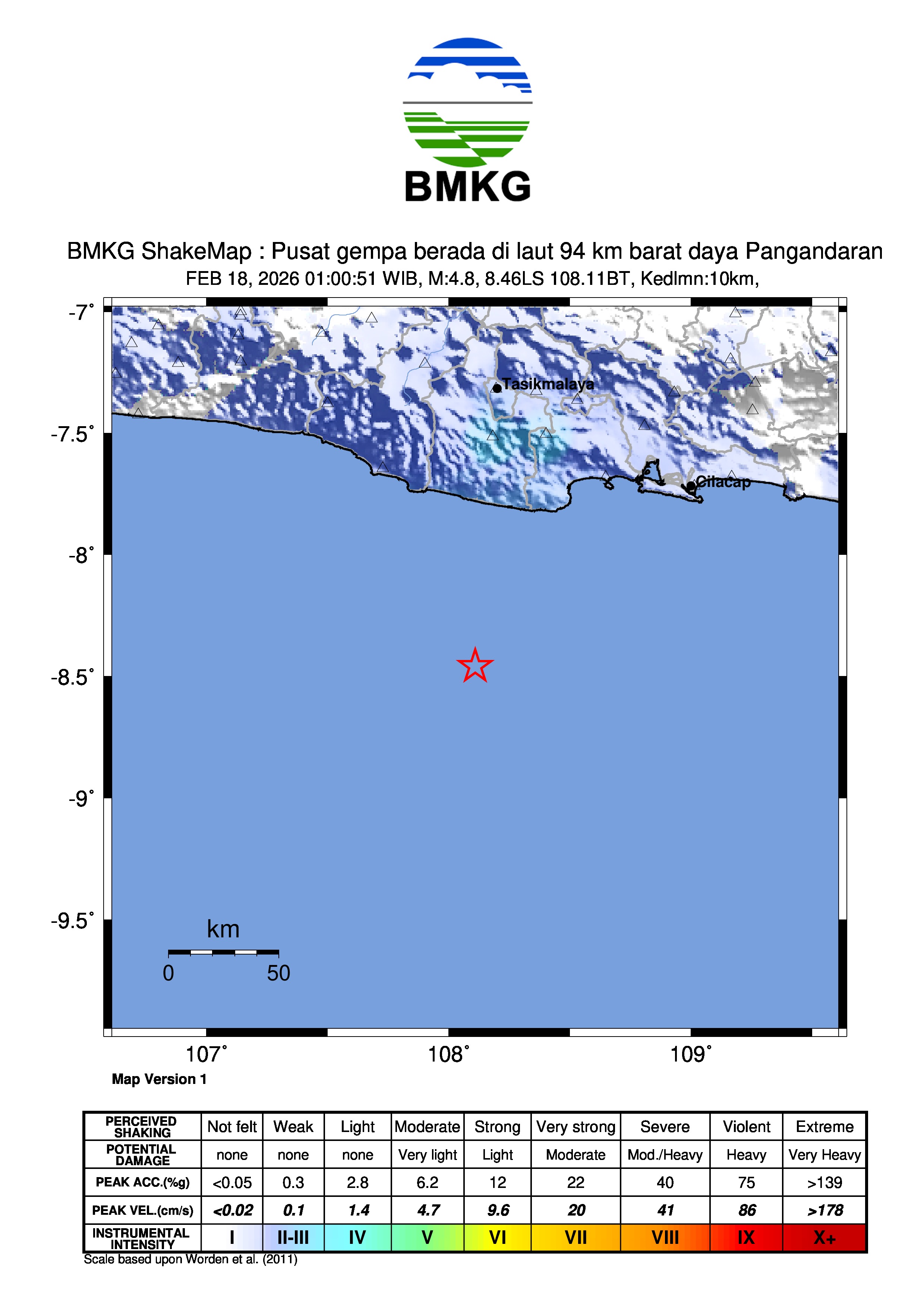 Pusat gempa berada di laut 94 km barat daya Pangandaran
