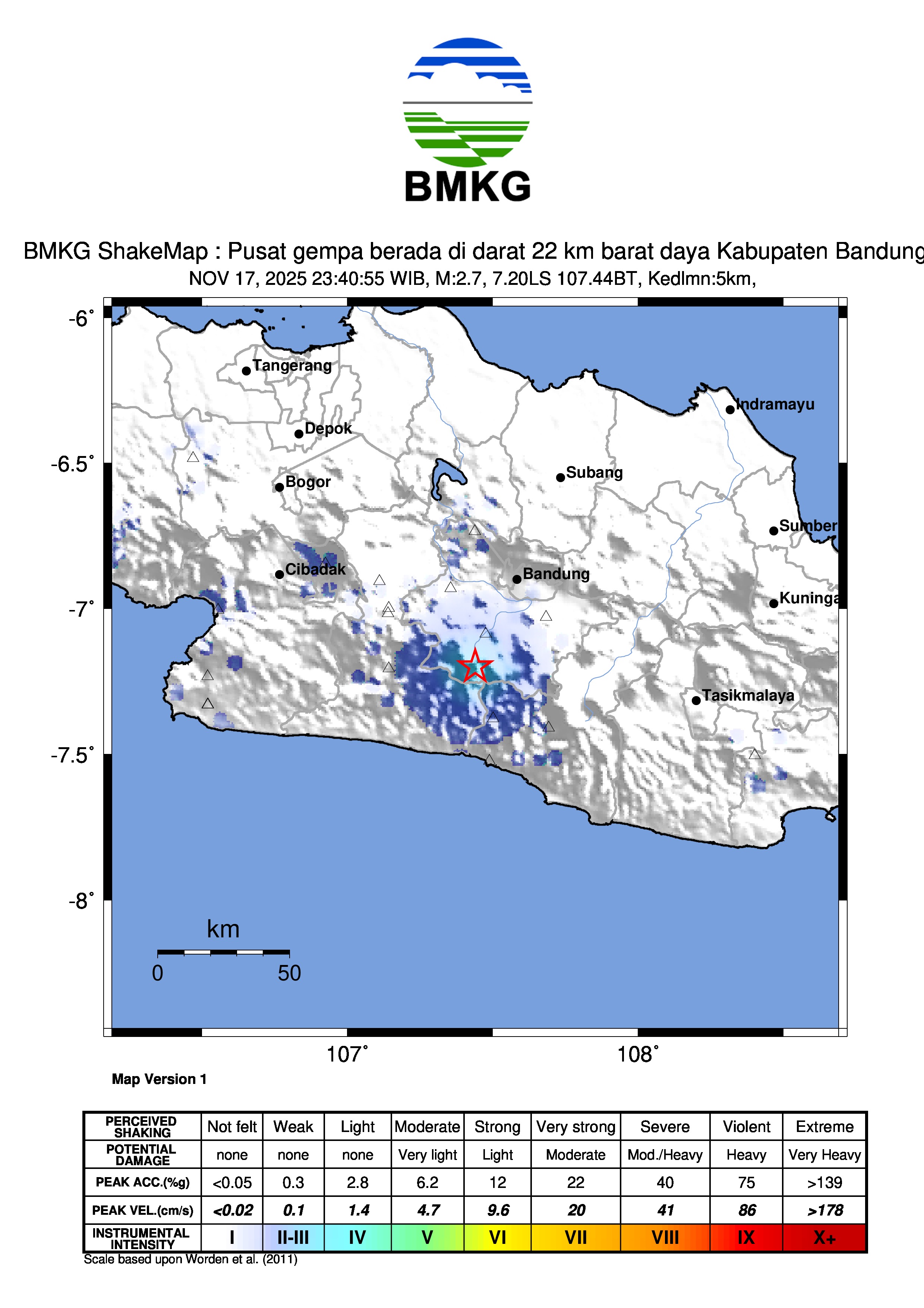 Pusat gempa berada di darat 22 km barat daya Kabupaten Bandung