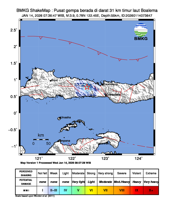 Pusat gempa berada di darat 31 km timur laut Boalema