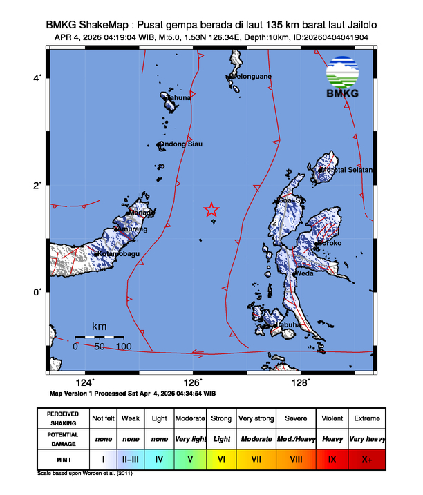 Pusat gempa berada di laut 135 km barat laut Jailolo