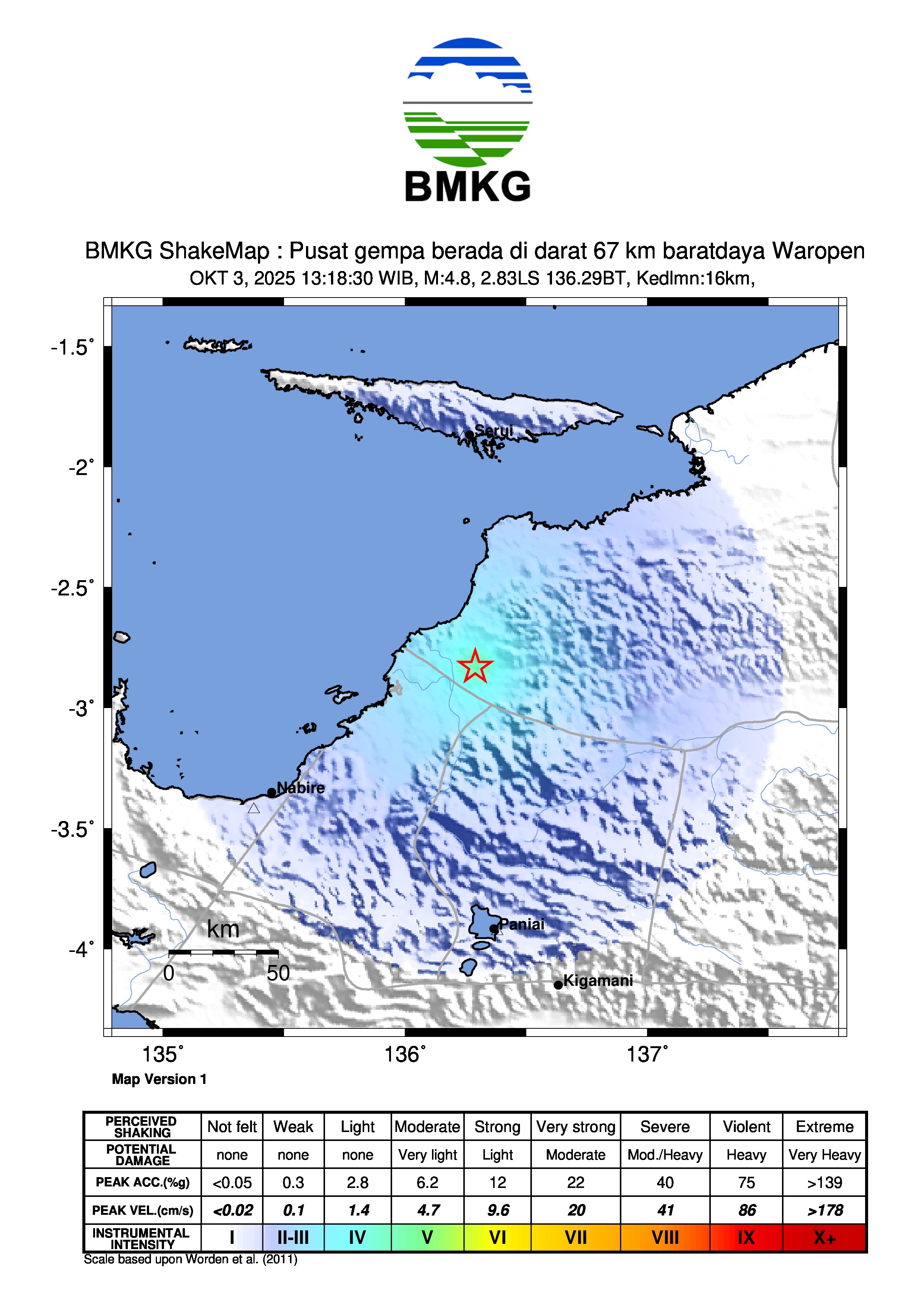 Pusat gempa berada di darat 67 km baratdaya Waropen