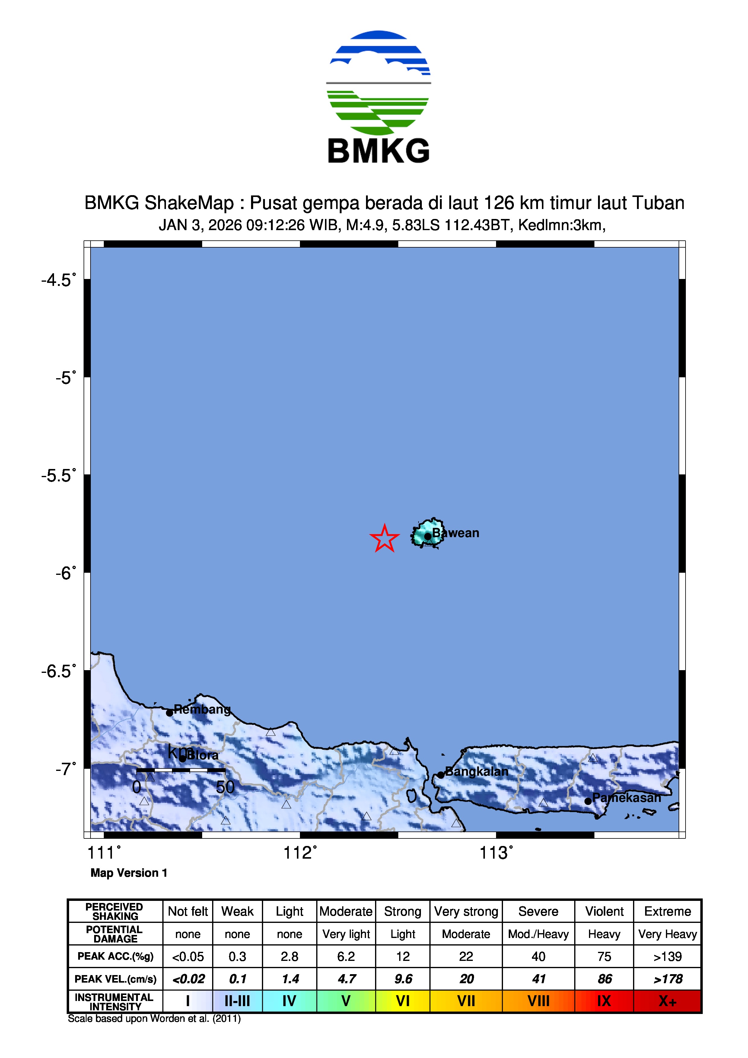 Pusat gempa berada di laut 126 km timur laut Tuban