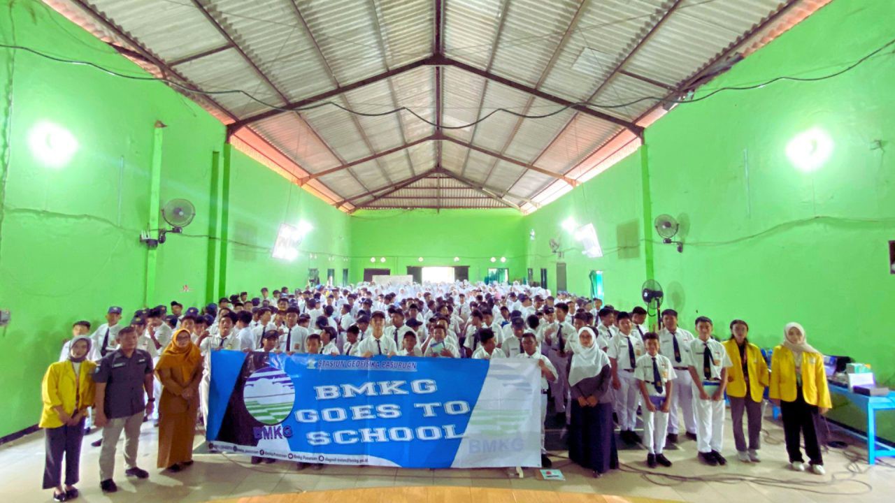Pasuruan, 4 Nopember 2024 – Stasiun Geofisika Pasuruan mengadakan kegiatan BMKG Goes to School dalam rangka memberikan literasi mitigasi gempabumi tsunami dan cuaca di SMP Negeri 1 Sukorejo – Pasuruan, Jawa Timur. Kegiatan ini menjadi ajang pembelajaran langsung bagi para siswa/i karena bisa bertemu dengan tim dari stasiun Geofisika Pasuruan dan bertanya terkait tugas dan fungsi BMKG khususnya dalam diseminasi informasi cuaca, iklim dan gempa bumi.