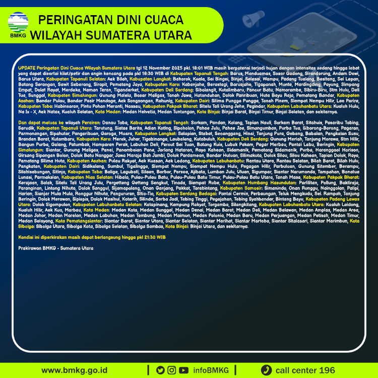 UPDATE Peringatan Dini Cuaca Wilayah Sumatera Utara tgl 12 November 2025 pkl. 18:01 WIB berpotensi terjadi hujan dengan intensitas sedang hingga lebat yang dapat disertai kilat/petir dan angin kencang pada pkl 18:30 WIB di