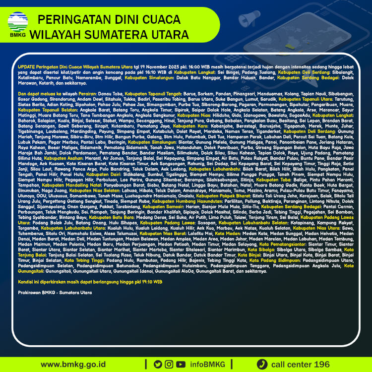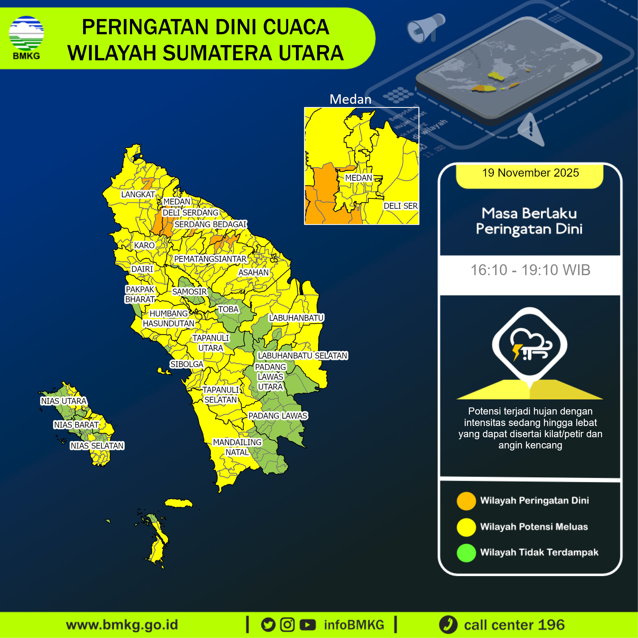 UPDATE Peringatan Dini Cuaca Wilayah Sumatera Utara tgl 19 November 2025 pkl. 16:00 WIB berpotensi terjadi hujan dengan intensitas sedang hingga lebat yang dapat disertai kilat/petir dan angin kencang pada pkl 16:10 WIB di