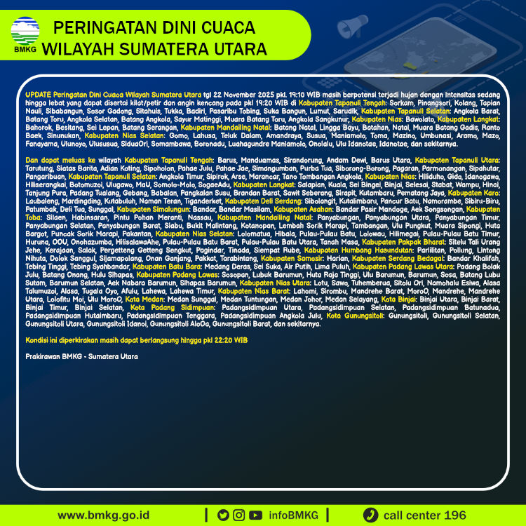 UPDATE Peringatan Dini Cuaca Wilayah Sumatera Utara tgl 22 November 2025 pkl. 19:10 WIB berpotensi terjadi hujan dengan intensitas sedang hingga lebat yang dapat disertai kilat/petir dan angin kencang pada pkl 19:20 WIB di