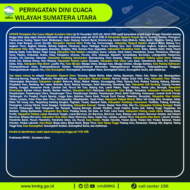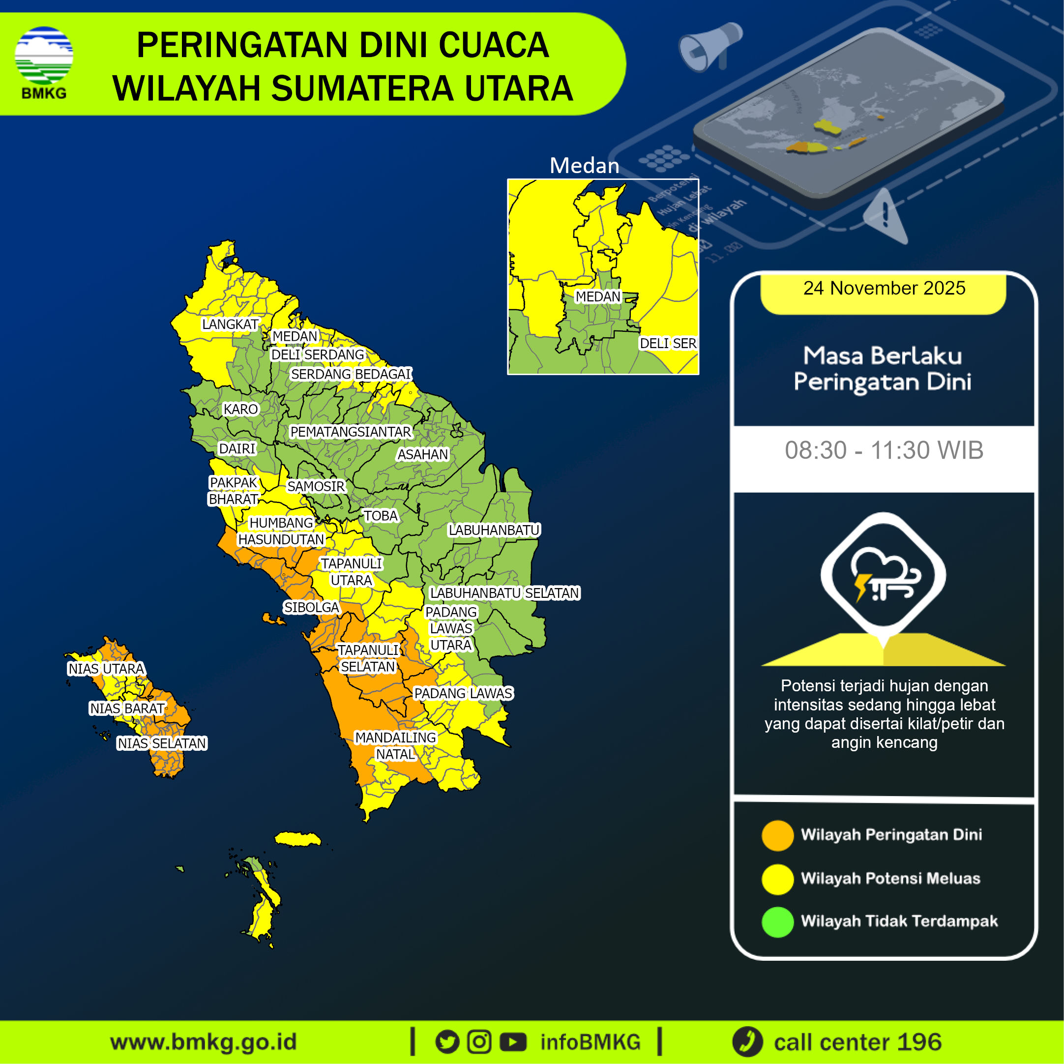 UPDATE Peringatan Dini Cuaca Wilayah Sumatera Utara tgl 24 November 2025 pkl. 08:00 WIB berpotensi terjadi hujan dengan intensitas sedang hingga lebat yang dapat disertai kilat/petir dan angin kencang pada pkl 08:30 WIB di