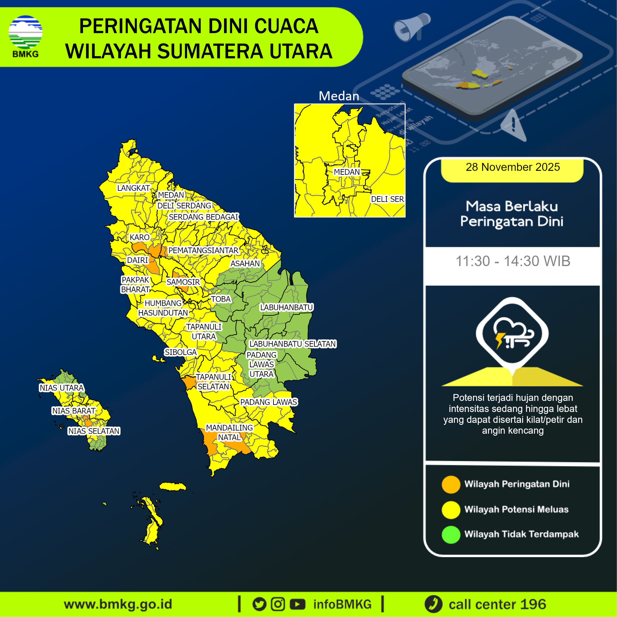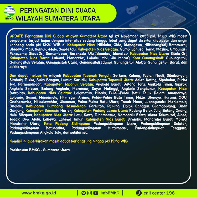 UPDATE Peringatan Dini Cuaca Wilayah Sumatera Utara tgl 28 November 2025 pkl. 11:00 WIB berpotensi terjadi hujan dengan intensitas sedang hingga lebat yang dapat disertai kilat/petir dan angin kencang pada pkl 11:30 WIB di