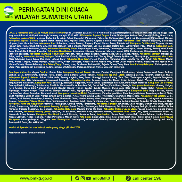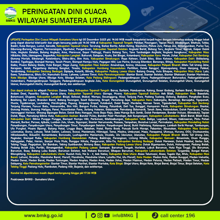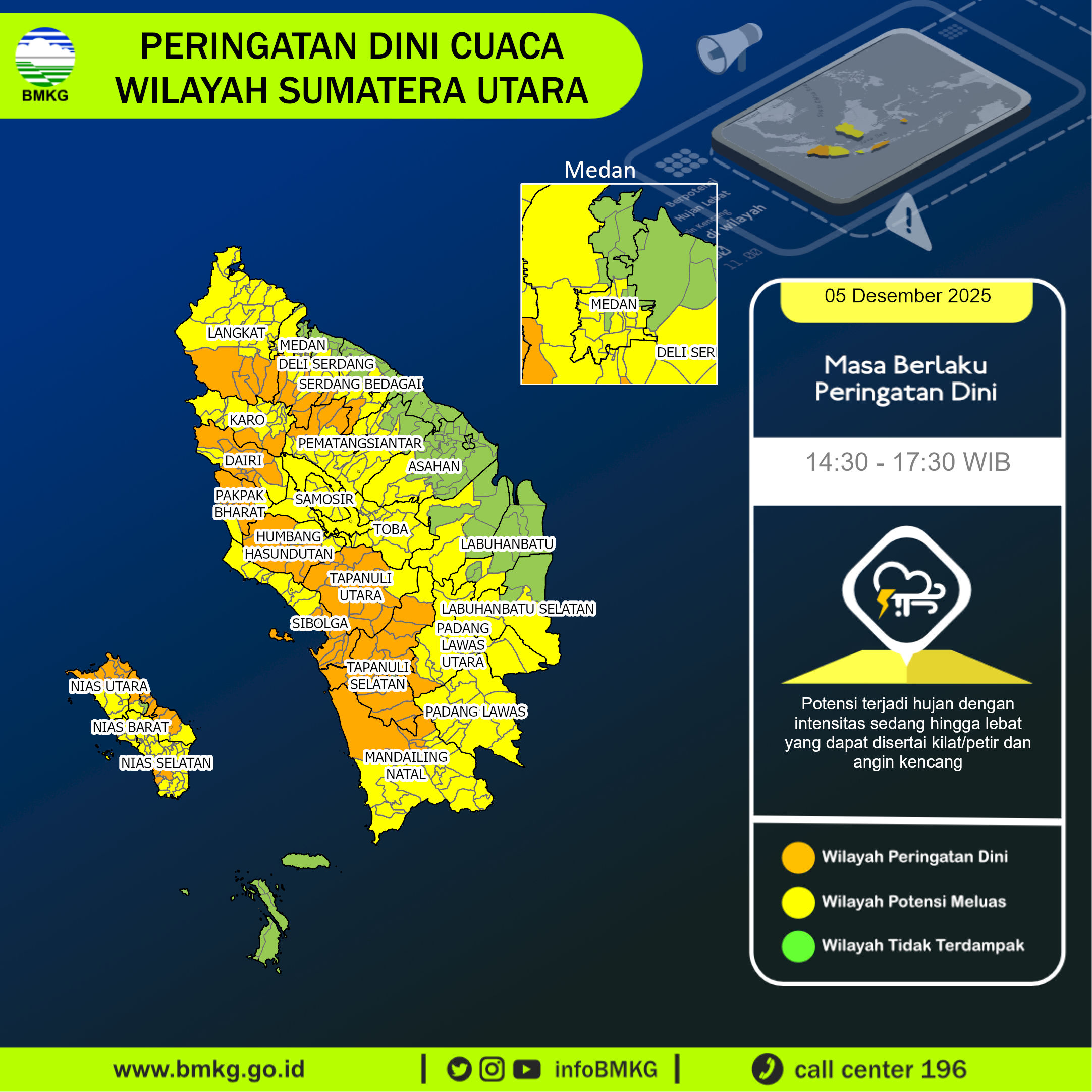 UPDATE Peringatan Dini Cuaca Wilayah Sumatera Utara tgl 05 Desember 2025 pkl. 14:00 WIB berpotensi terjadi hujan dengan intensitas sedang hingga lebat yang dapat disertai kilat/petir dan angin kencang pada pkl 14:30 WIB di