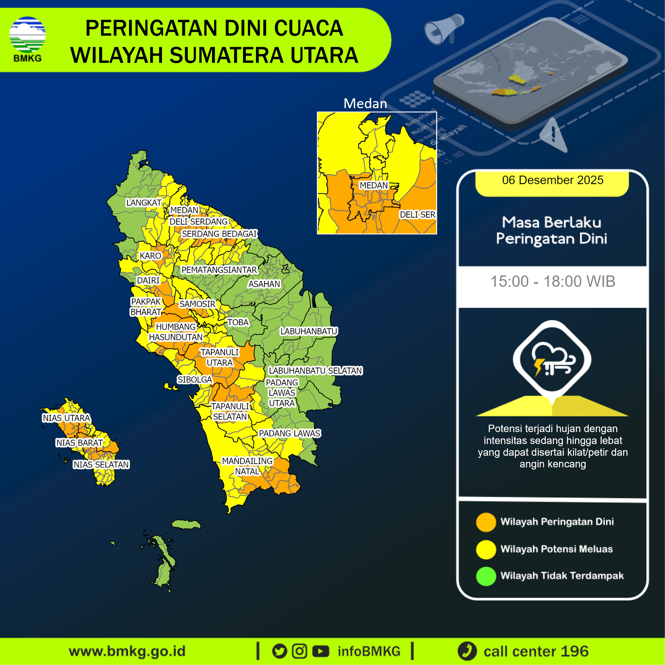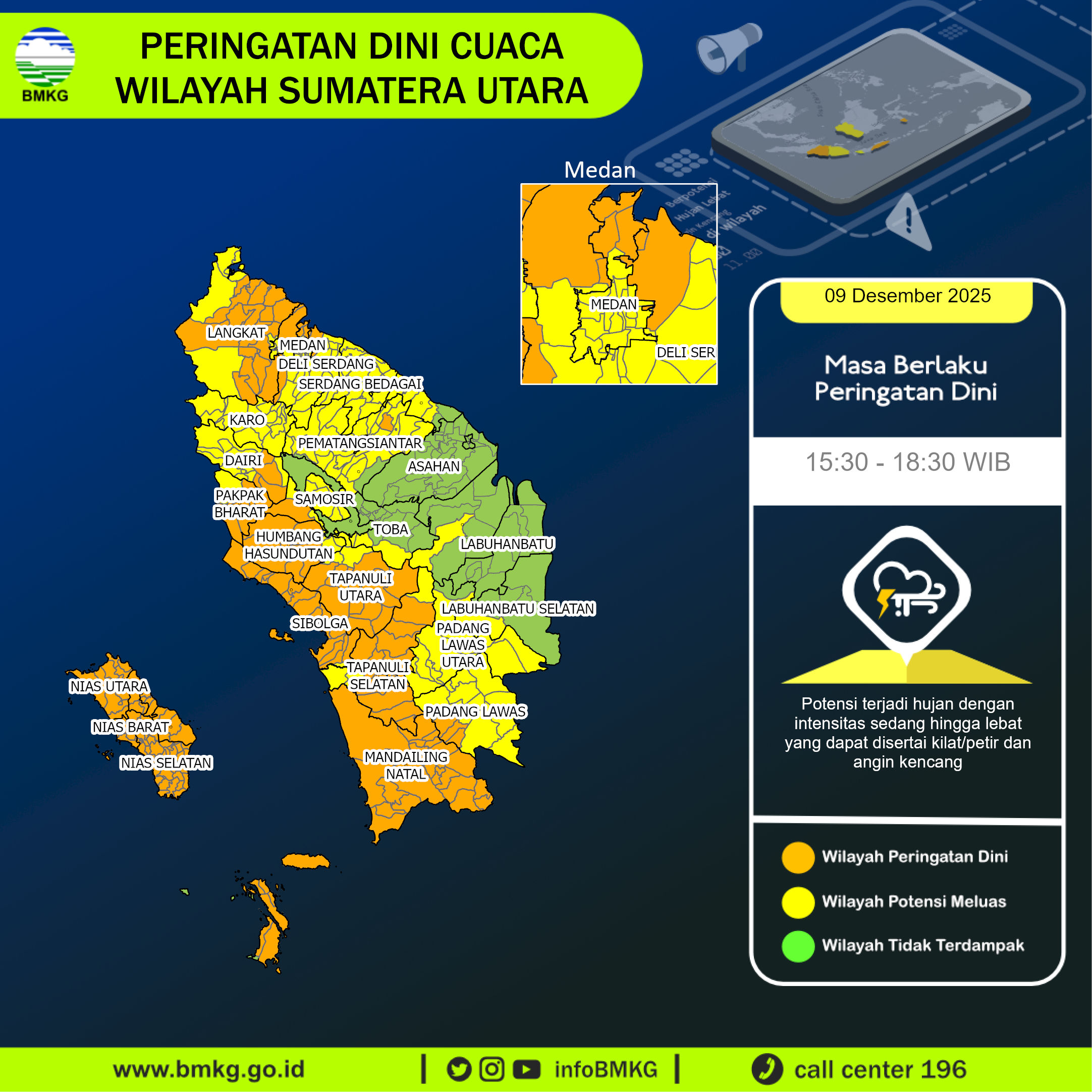 Peringatan dini hujan sedang hingga lebat yang dapat disertai petir dan angin kencang di wilayah Sumatera Utara