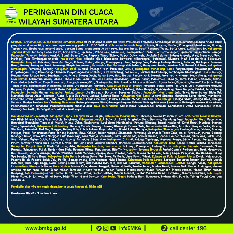 UPDATE Peringatan Dini Cuaca Wilayah Sumatera Utara tgl 12 Desember 2025 pkl. 16:50 WIB berpotensi terjadi hujan dengan intensitas sedang hingga lebat yang dapat disertai kilat/petir dan angin kencang pada pkl 17:00 WIB di