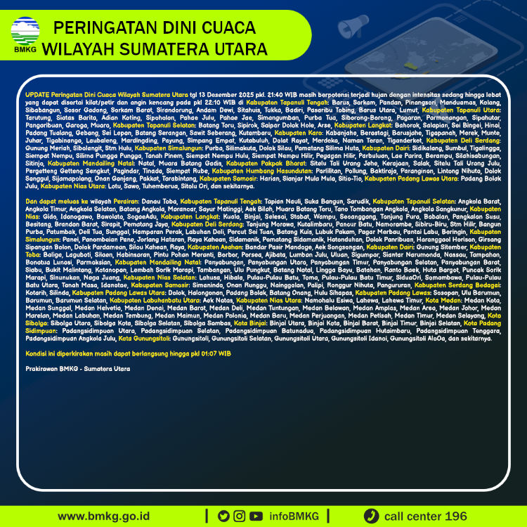 UPDATE Peringatan Dini Cuaca Wilayah Sumatera Utara tgl 13 Desember 2025 pkl. 21:40 WIB berpotensi terjadi hujan dengan intensitas sedang hingga lebat yang dapat disertai kilat/petir dan angin kencang pada pkl 22:10 WIB di