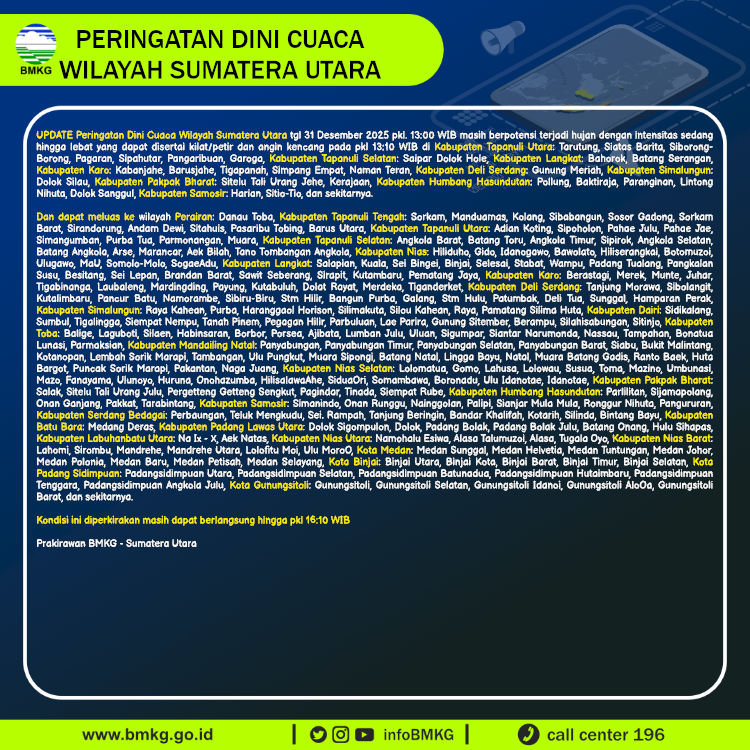 UPDATE Peringatan Dini Cuaca Wilayah Sumatera Utara tgl 31 Desember 2025 pkl. 13:00 WIB berpotensi terjadi hujan dengan intensitas sedang hingga lebat yang dapat disertai kilat/petir dan angin kencang pada pkl 13:10 WIB di