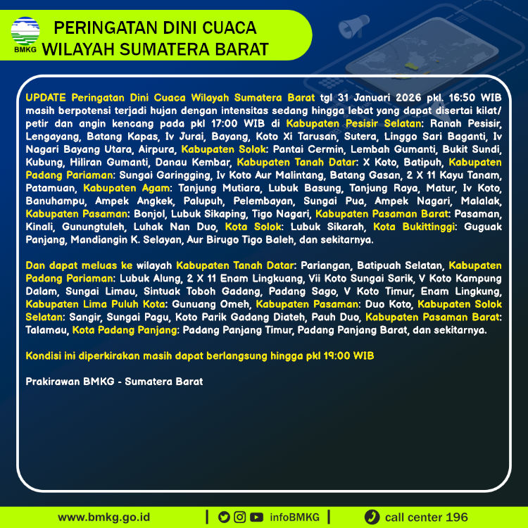 UPDATE Peringatan Dini Cuaca Wilayah Sumatera Barat tgl 31 Januari 2026 pkl. 16:50 WIB berpotensi terjadi hujan dengan intensitas sedang hingga lebat yang dapat disertai kilat/petir dan angin kencang pada pkl 17:00 WIB di