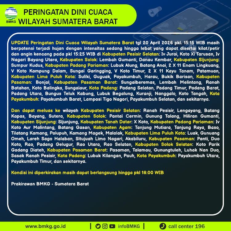 UPDATE Peringatan Dini Cuaca Wilayah Sumatera Barat tgl 20 April 2026 pkl. 15:15 WIB berpotensi terjadi hujan dengan intensitas sedang hingga lebat yang dapat disertai kilat/petir dan angin kencang pada pkl 15:25 WIB di