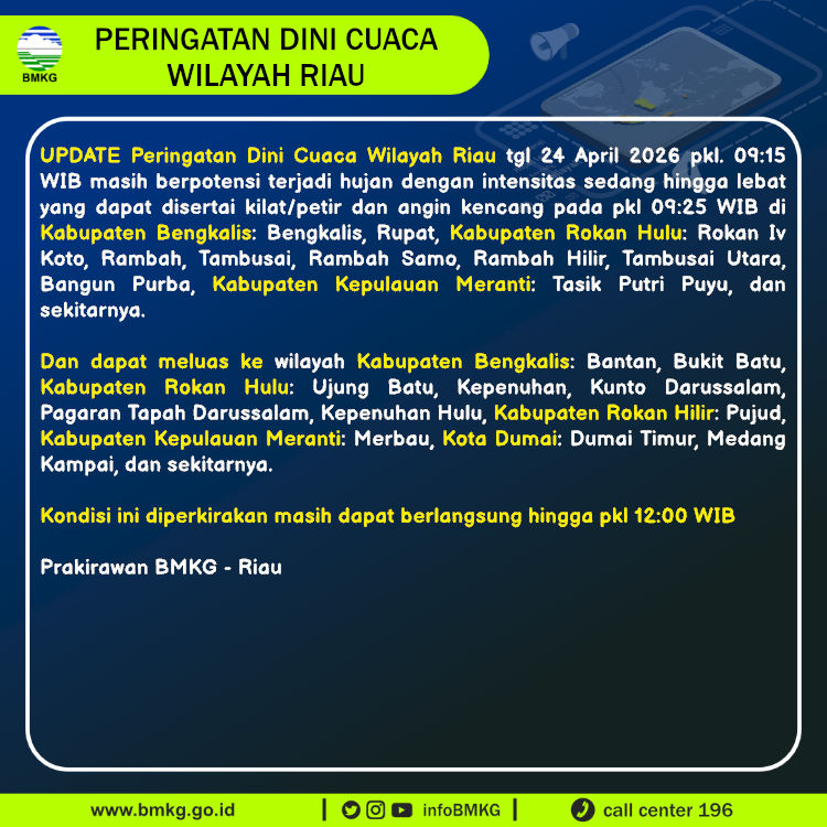 UPDATE Peringatan Dini Cuaca Wilayah Riau tgl 24 April 2026 pkl. 09:15 WIB berpotensi terjadi hujan dengan intensitas sedang hingga lebat yang dapat disertai kilat/petir dan angin kencang pada pkl 09:25 WIB di