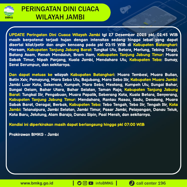 UPDATE Peringatan Dini Cuaca Wilayah Jambi tgl 27 Desember 2025 pkl. 02:45 WIB berpotensi terjadi hujan dengan intensitas sedang hingga lebat yang dapat disertai kilat/petir dan angin kencang pada pkl 03:15 WIB di