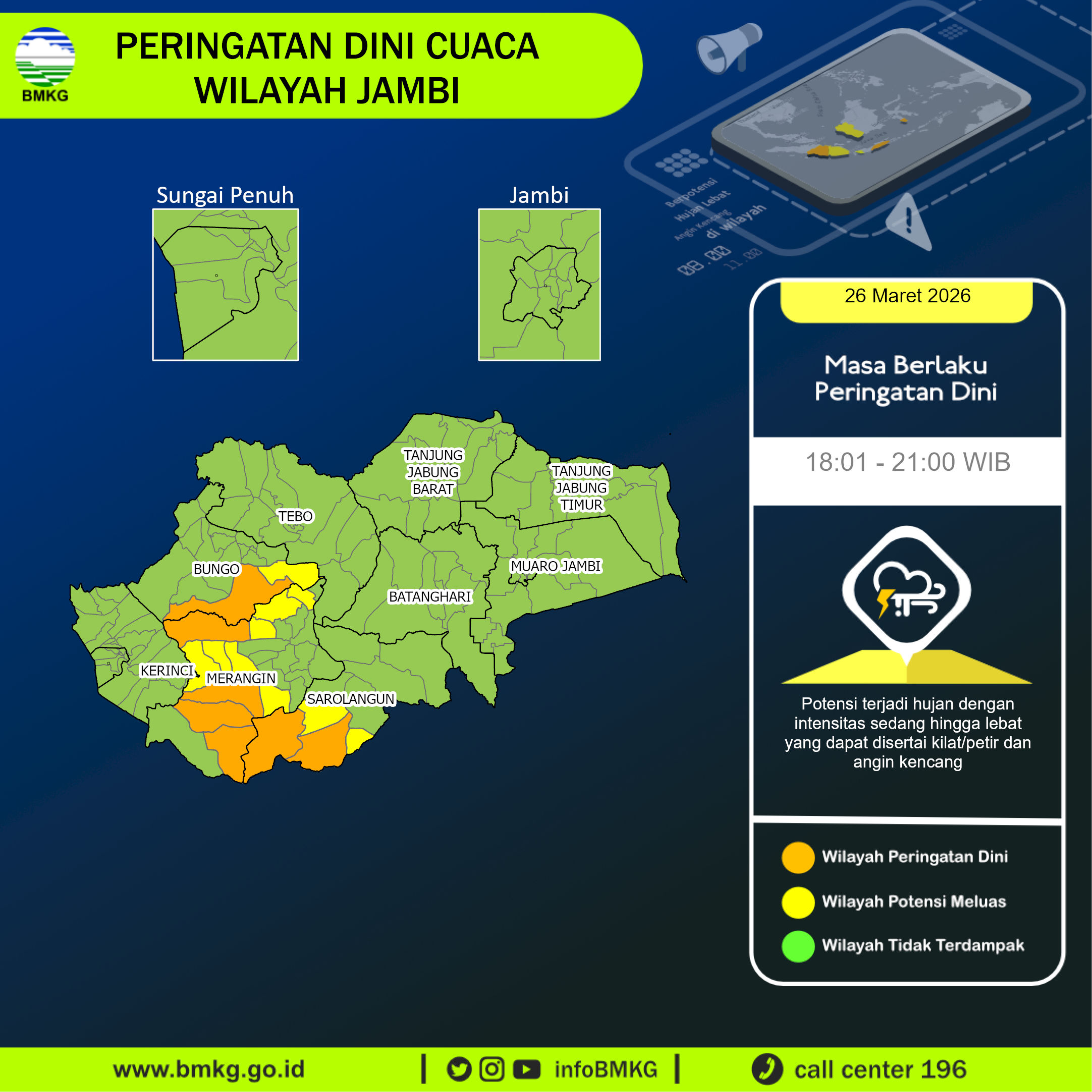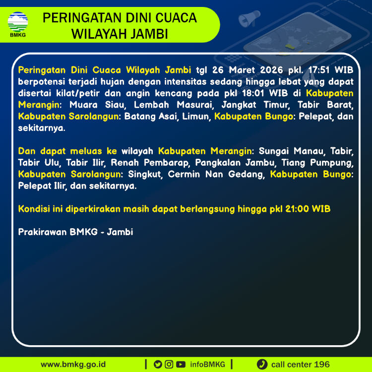 Peringatan Dini Cuaca Wilayah Jambi tgl 26 Maret 2026 pkl. 17:51 WIB berpotensi terjadi hujan dengan intensitas sedang hingga lebat yang dapat disertai kilat/petir dan angin kencang pada pkl 18:01 WIB di