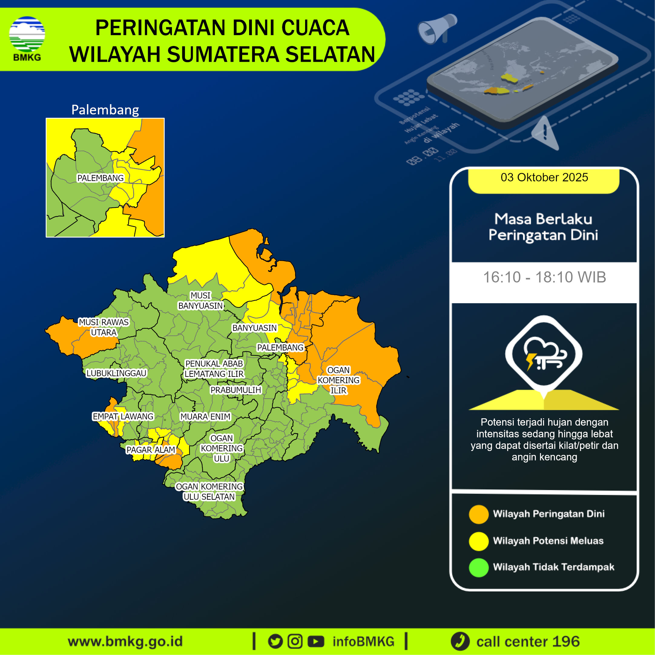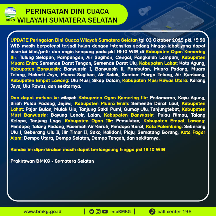 UPDATE Peringatan Dini Cuaca Wilayah Sumatera Selatan tgl 03 Oktober 2025 pkl. 15:50 WIB berpotensi terjadi hujan dengan intensitas sedang hingga lebat yang dapat disertai kilat/petir dan angin kencang pada pkl 16:10 WIB di