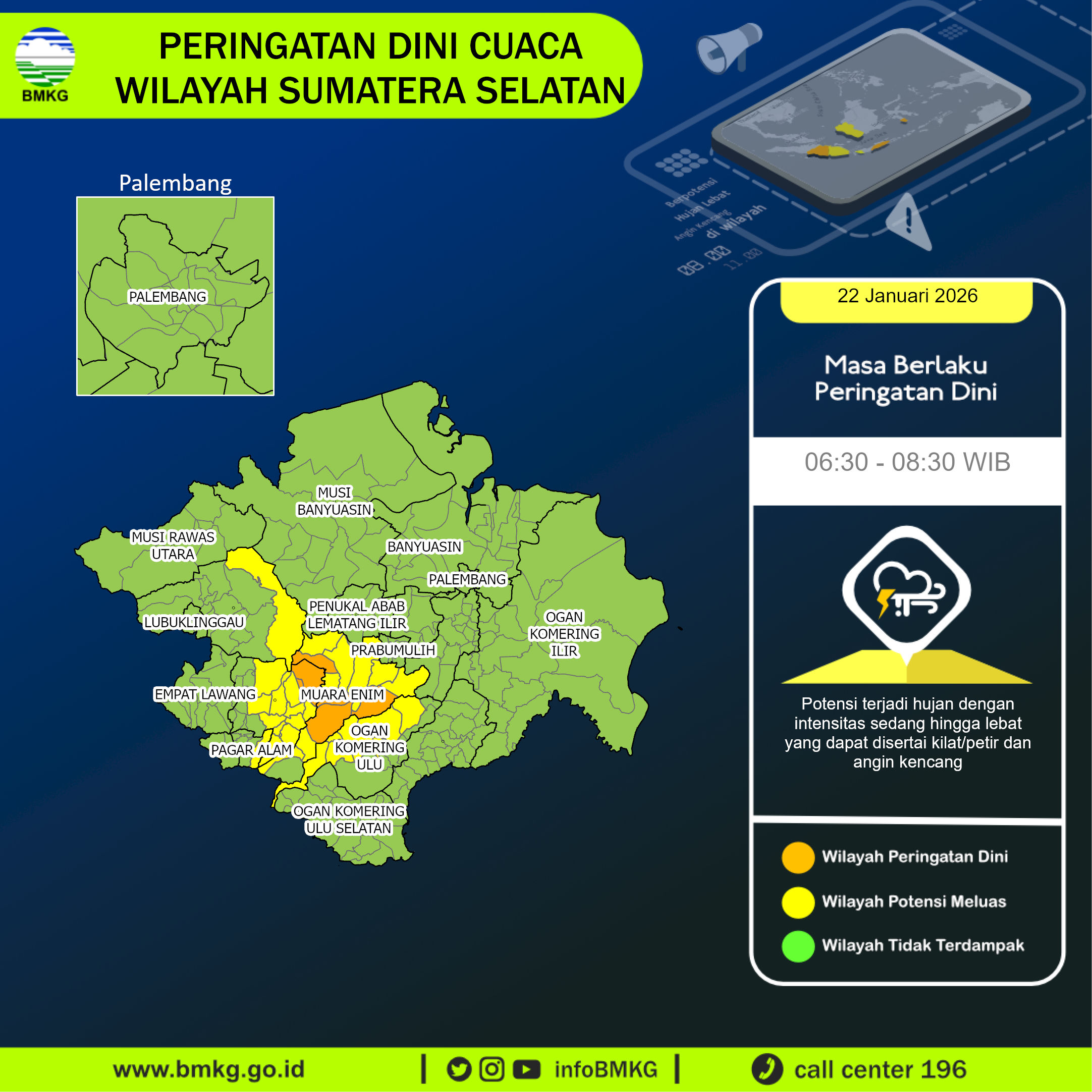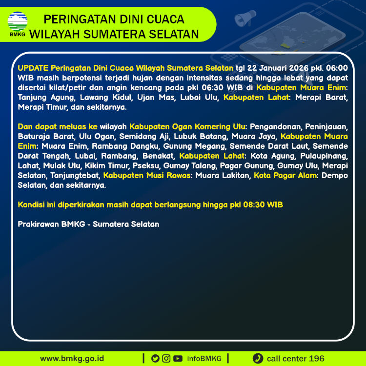 UPDATE Peringatan Dini Cuaca Wilayah Sumatera Selatan tgl 22 Januari 2026 pkl. 06:00 WIB berpotensi terjadi hujan dengan intensitas sedang hingga lebat yang dapat disertai kilat/petir dan angin kencang pada pkl 06:30 WIB di